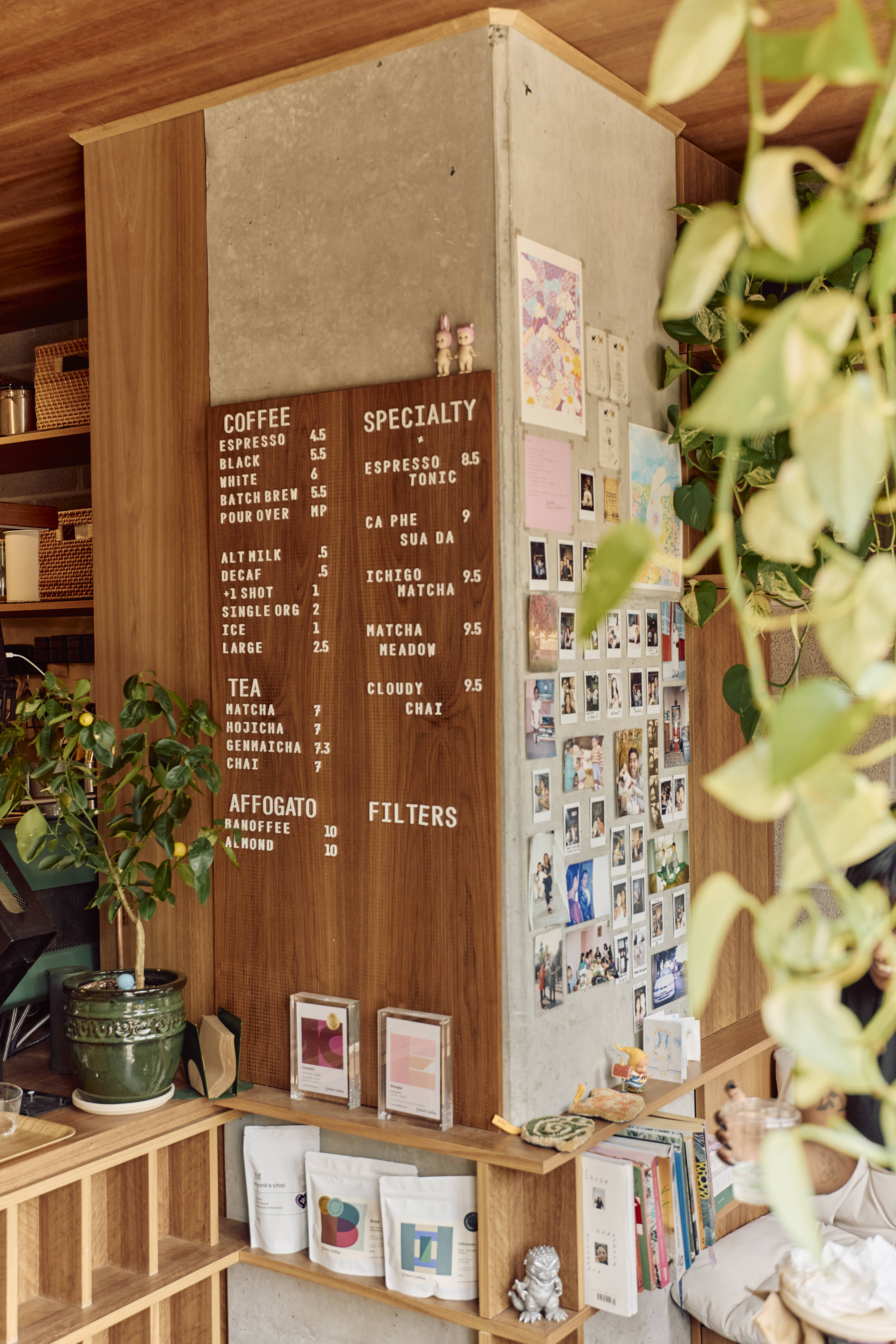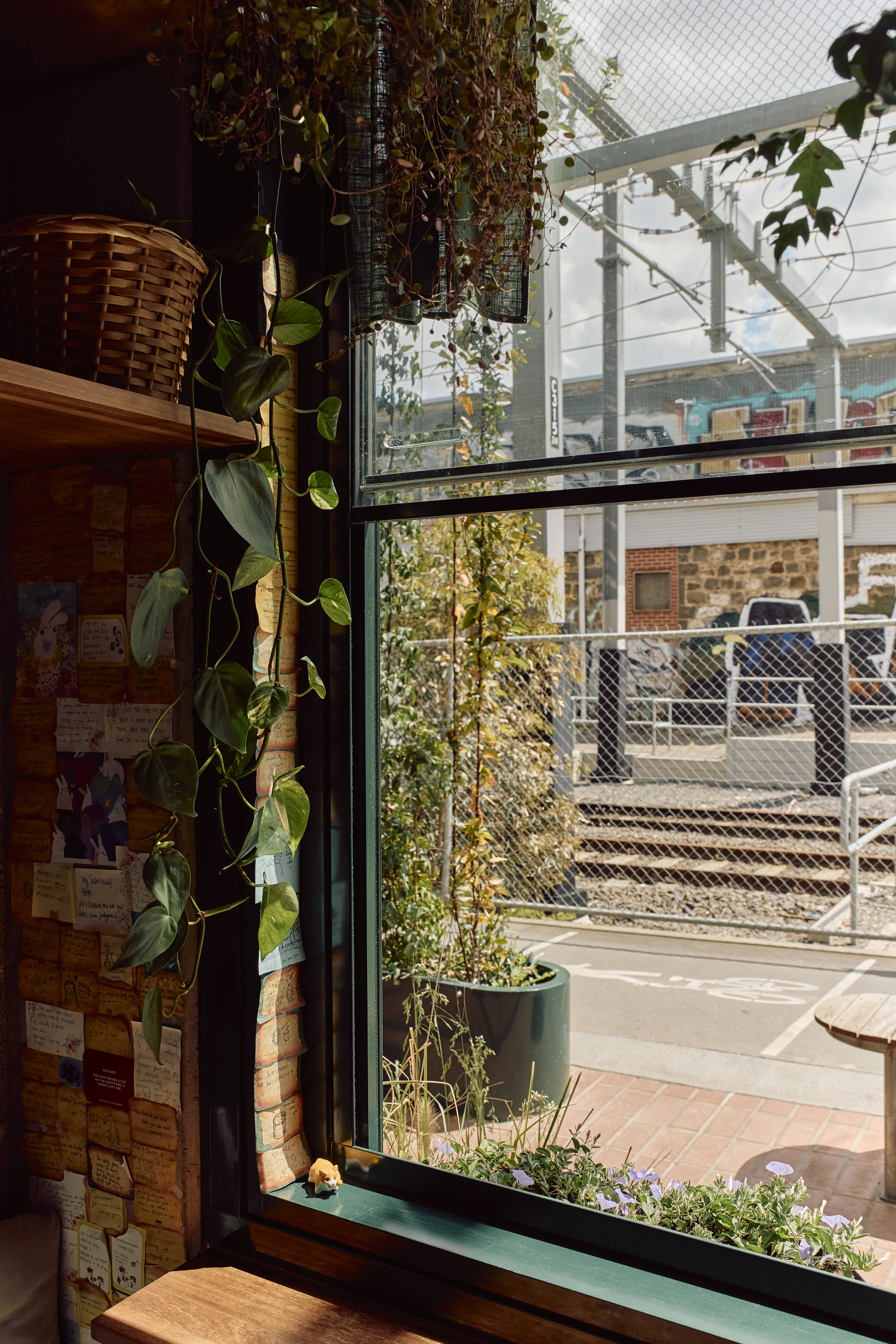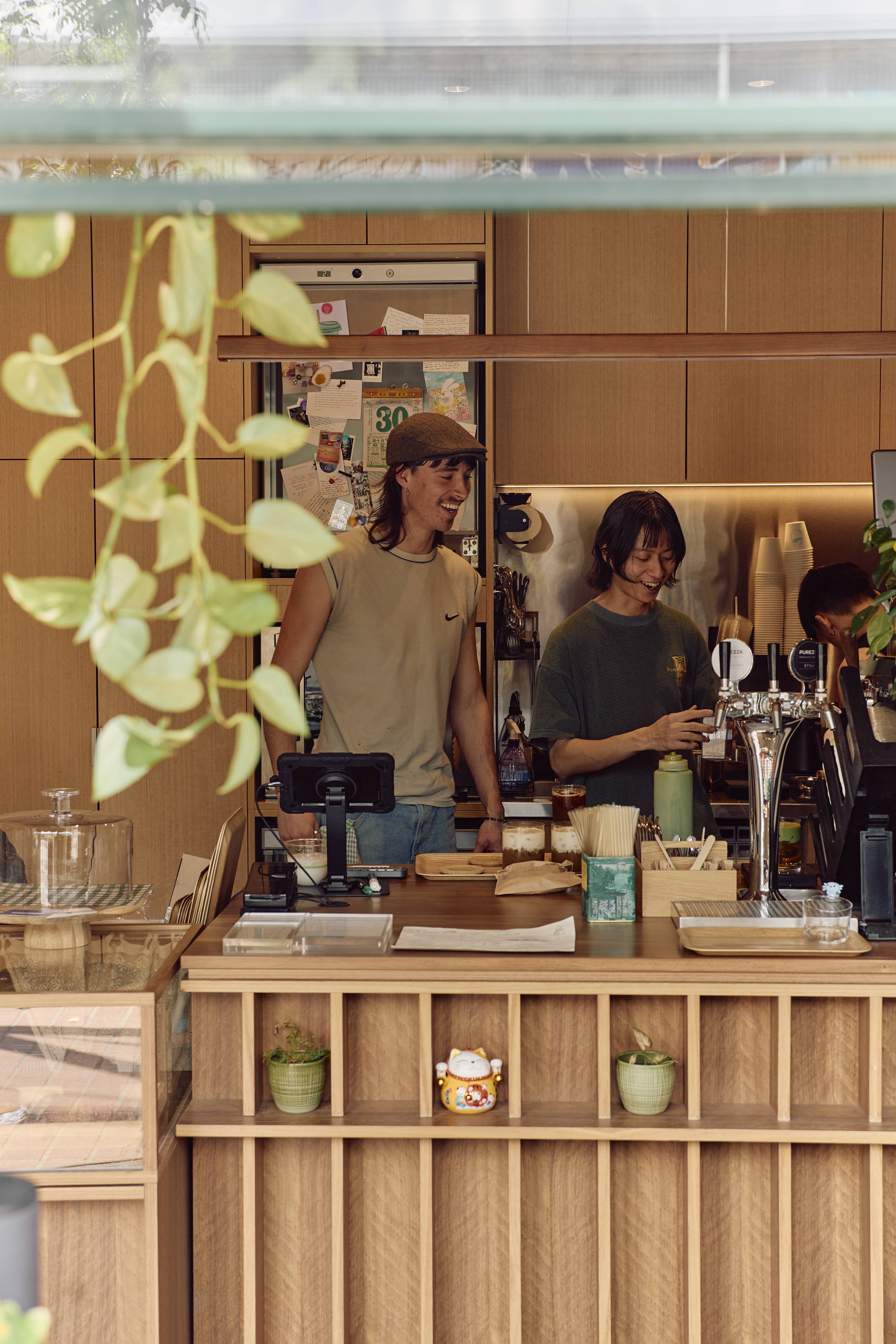 The cafe features a tightly packed service area designed for the meticulous preparation of every ingredient. The front-of-house area includes a cozy lounge and a slim leaner against the windows. Every inch of the space is filled with art, carefully curated characters, books, and handwritten notes. Outside, customers spill onto the footpath and nearby bleacher seating, creating a vibrant hum of activity.