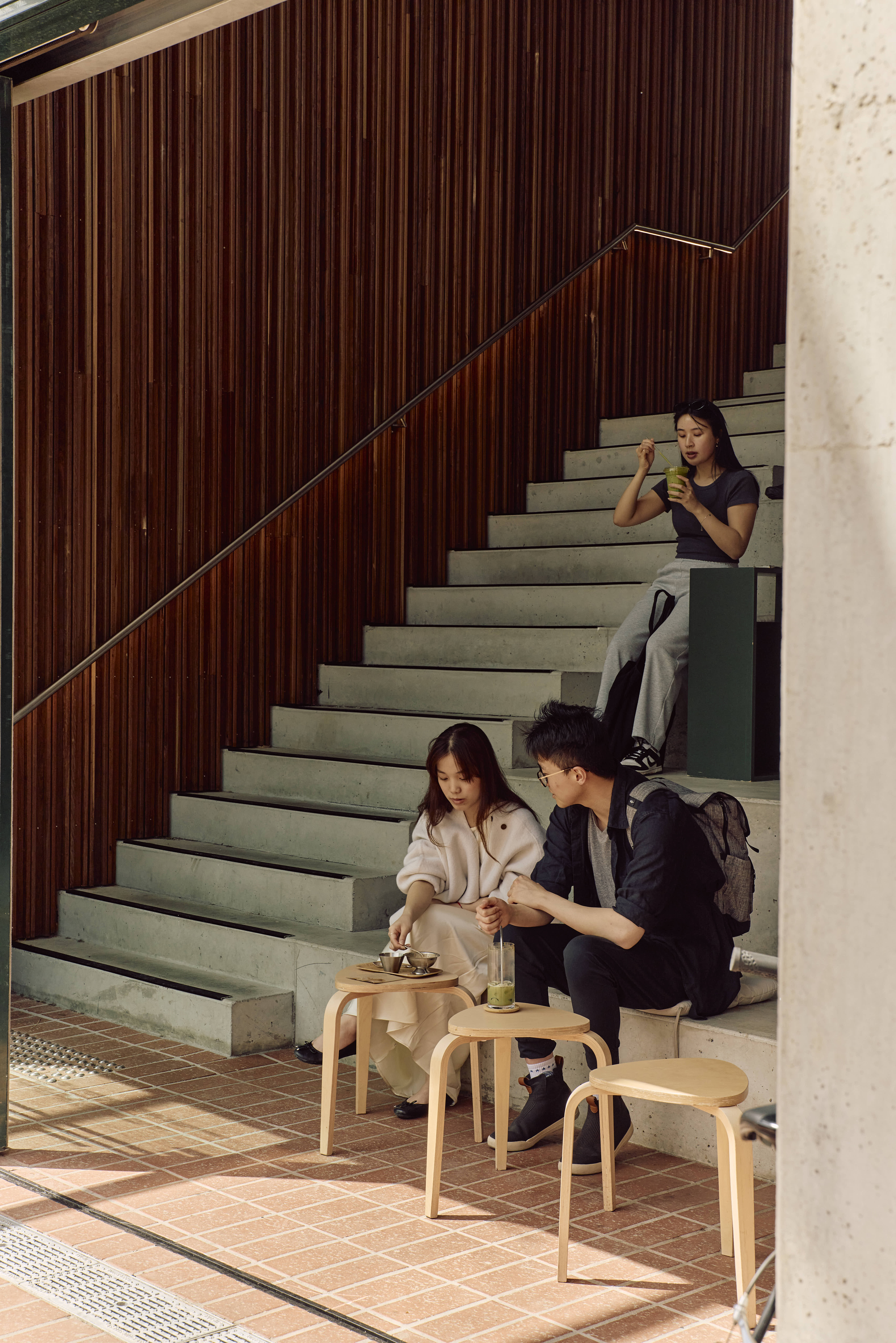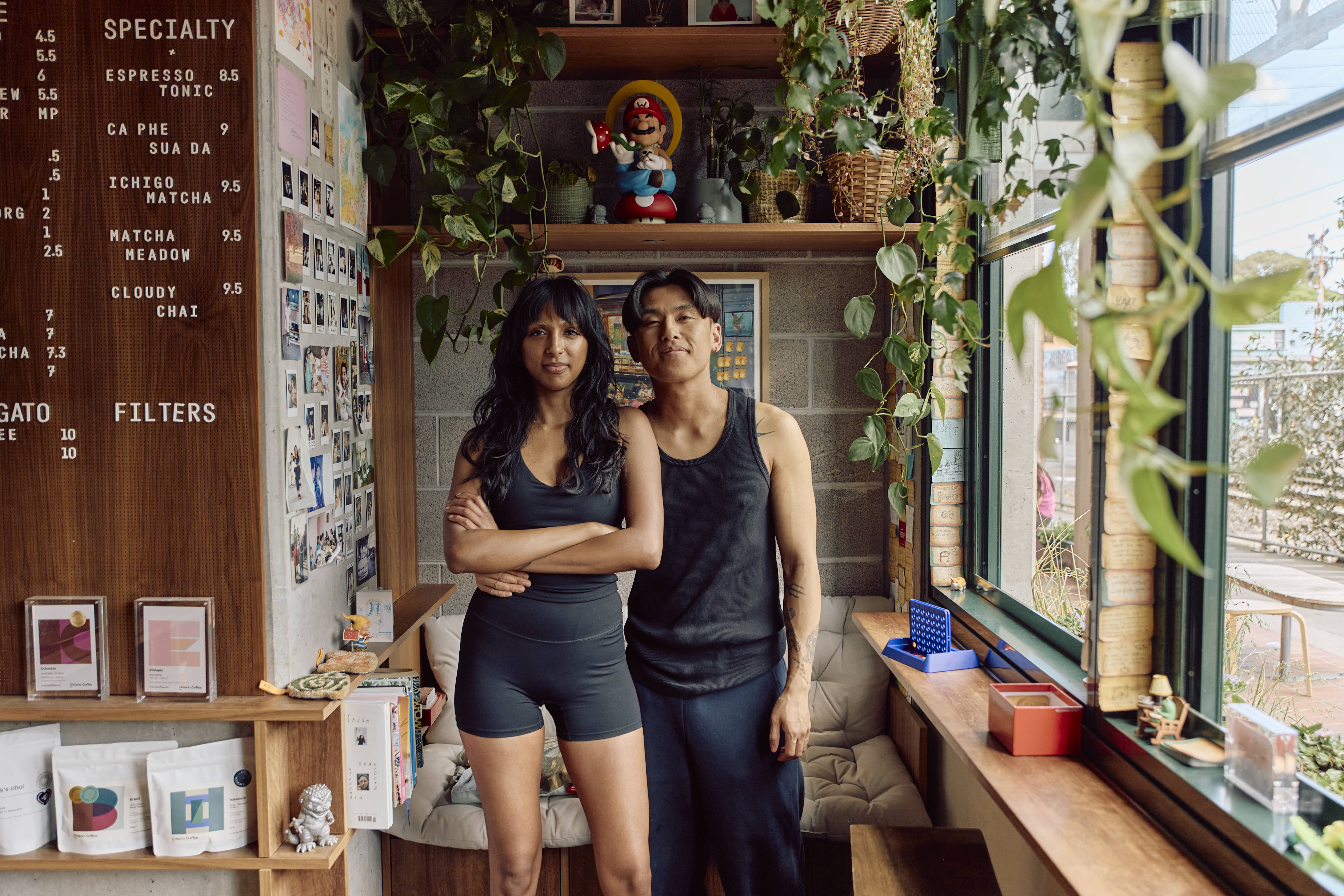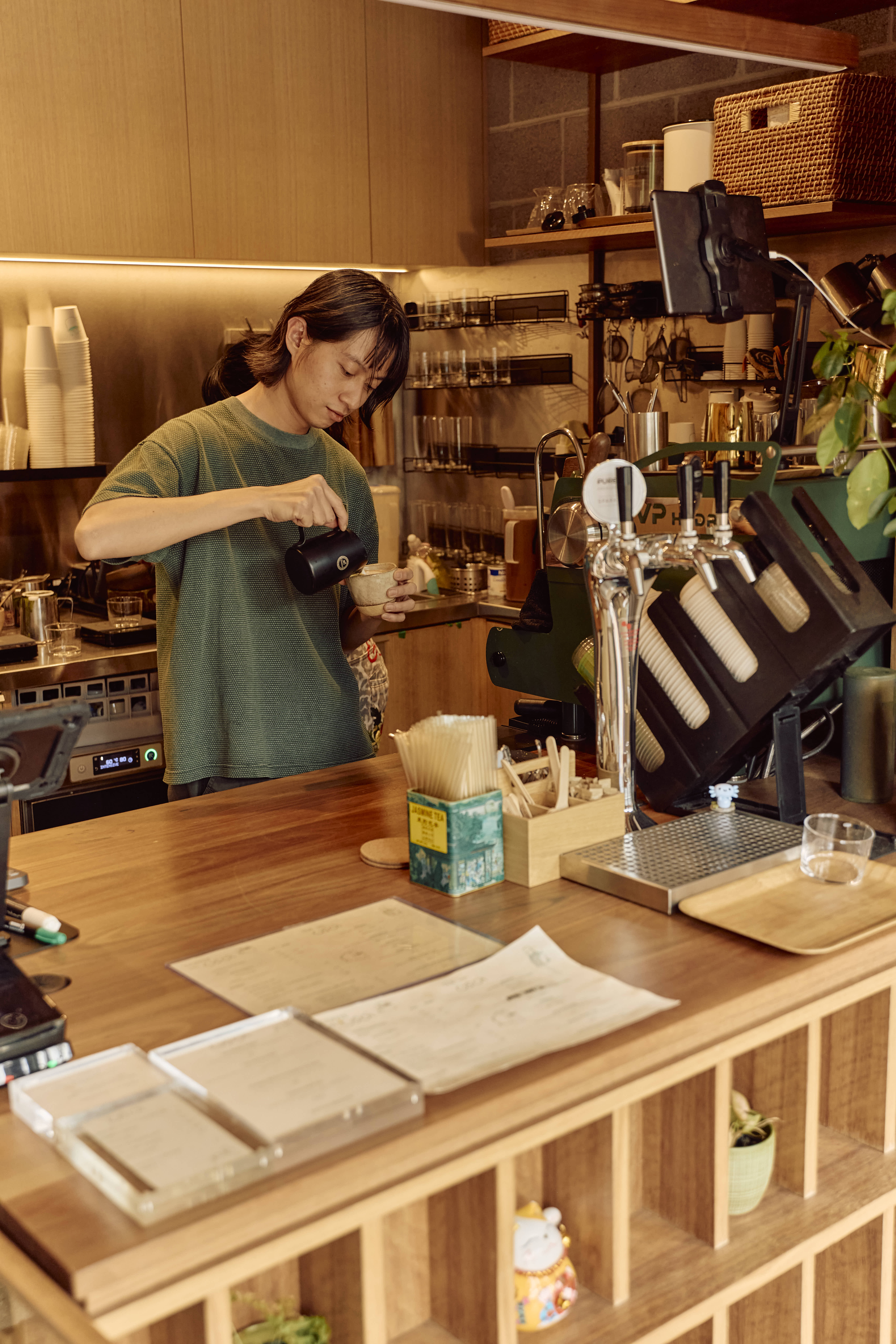 The cafe features a tightly packed service area designed for the meticulous preparation of every ingredient. The front-of-house area includes a cozy lounge and a slim leaner against the windows. Every inch of the space is filled with art, carefully curated characters, books, and handwritten notes. Outside, customers spill onto the footpath and nearby bleacher seating, creating a vibrant hum of activity.