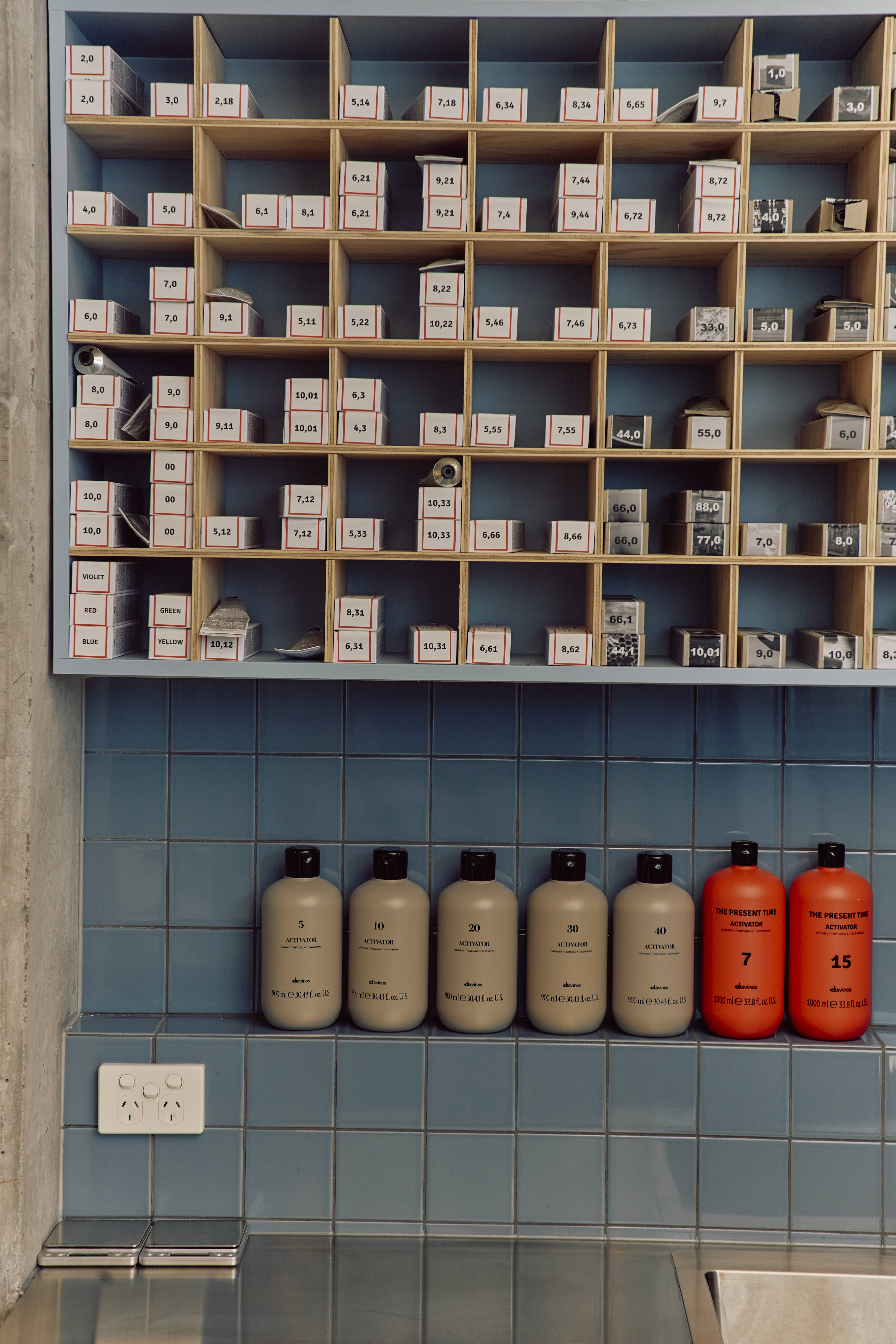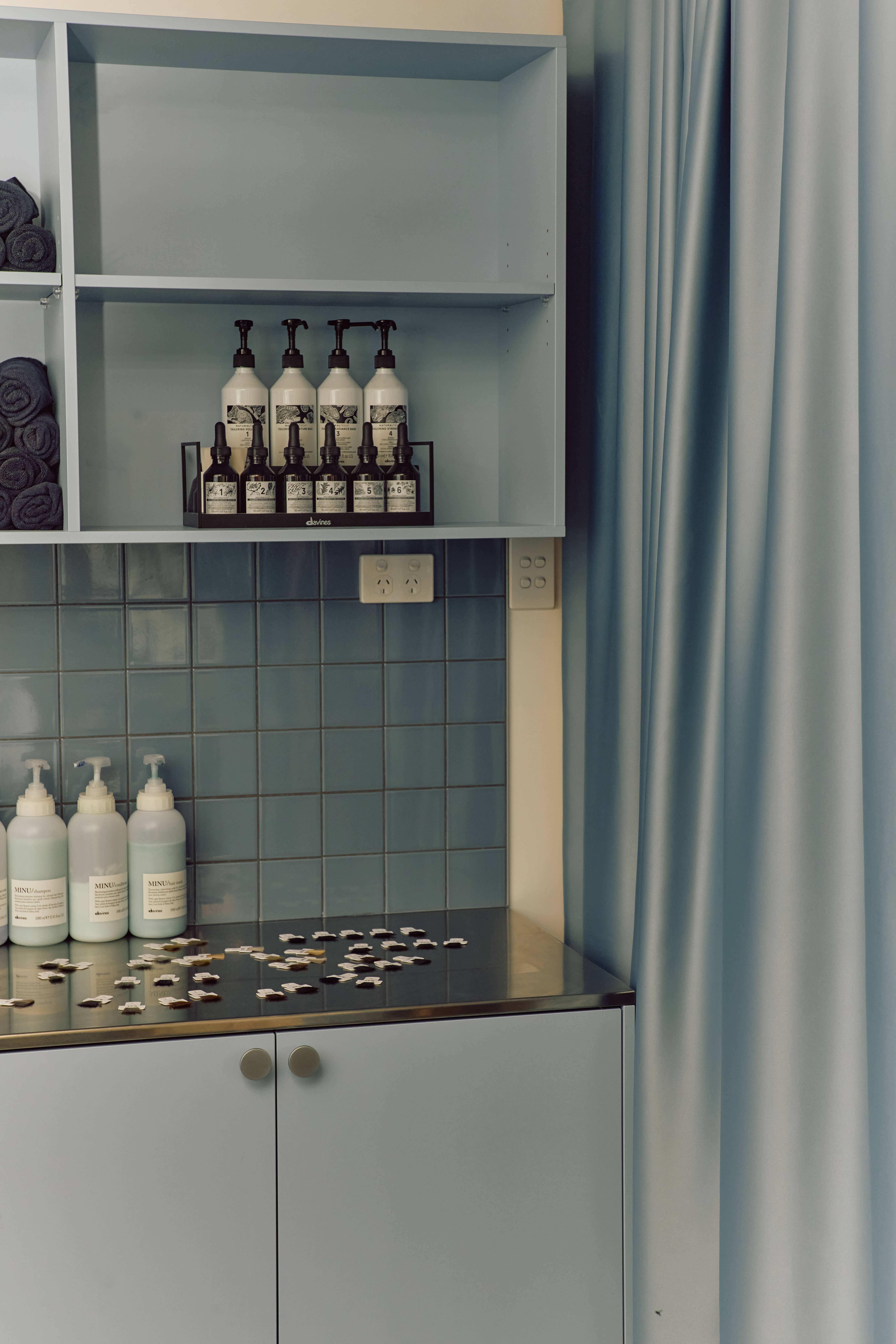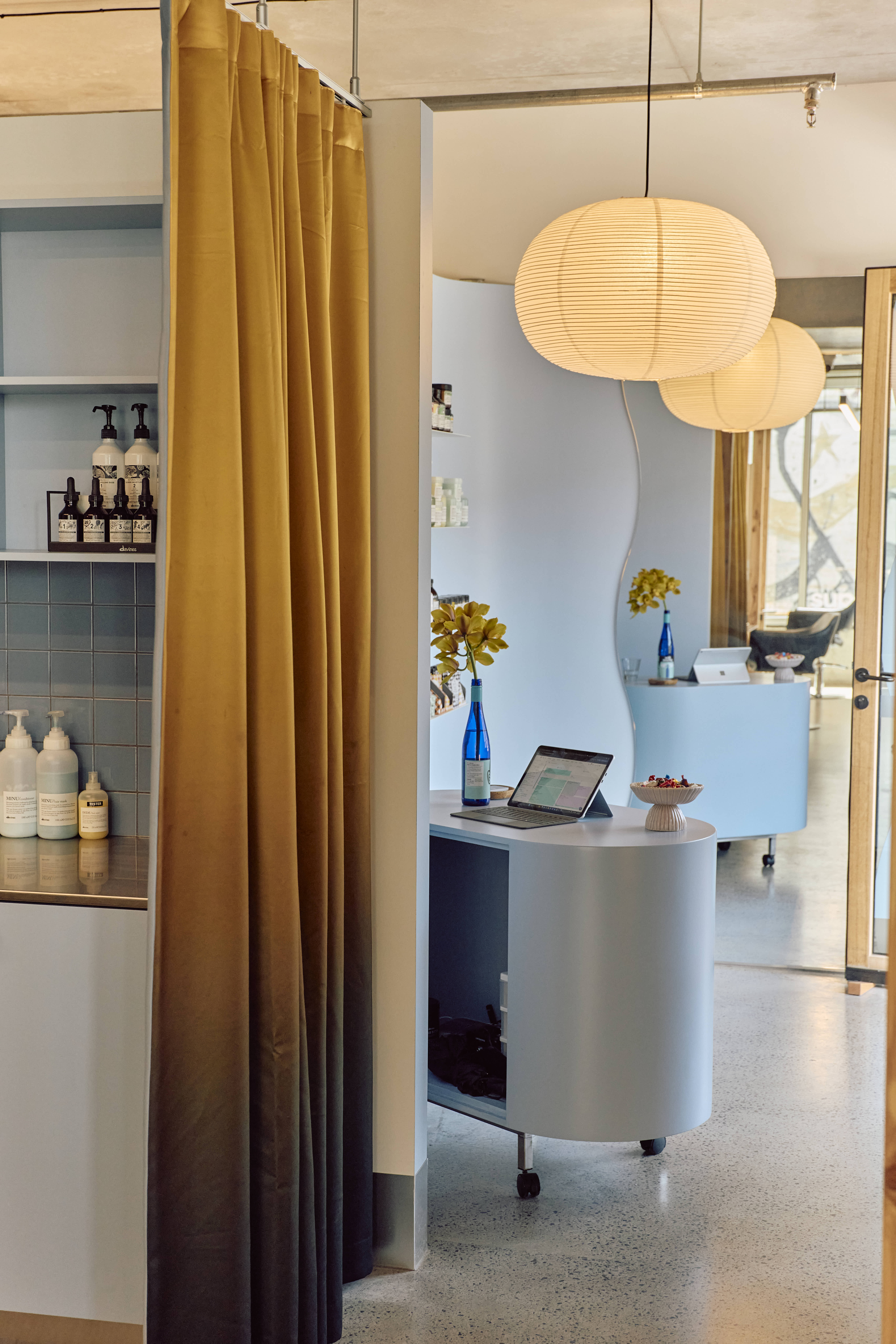 The small space uses a mix of natural materials and vibrant immersive colour to delineate different areas. Visitors are met at the entry by smooth blue curves and shelves displaying a selection of perfectly pastel retail products. The zone is saturated in a light blue colour, that reappears subtly throughout the rest of the salon, including a tiled blue ledge along the windows and cabinets stained a deep blue by Jess herself.