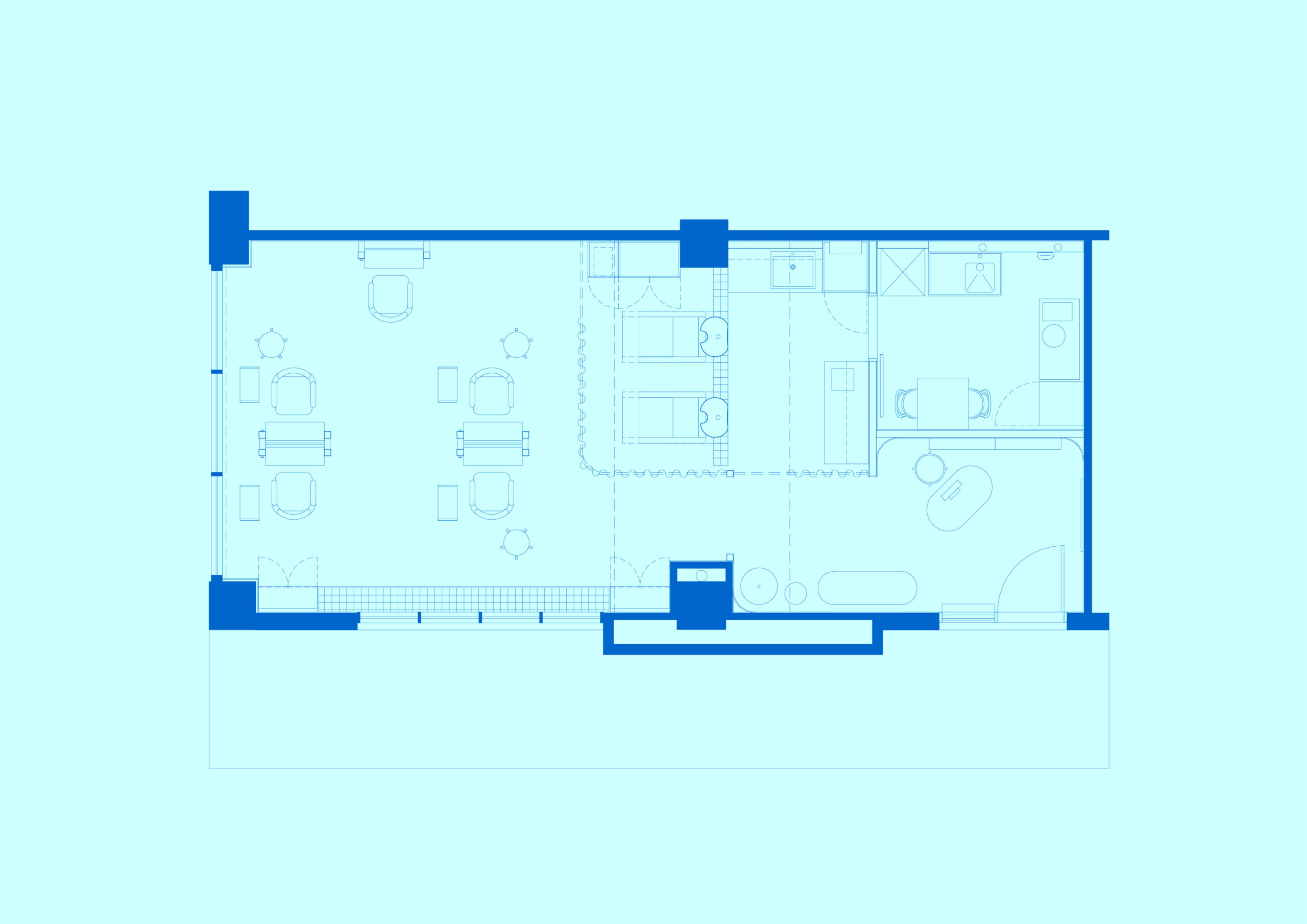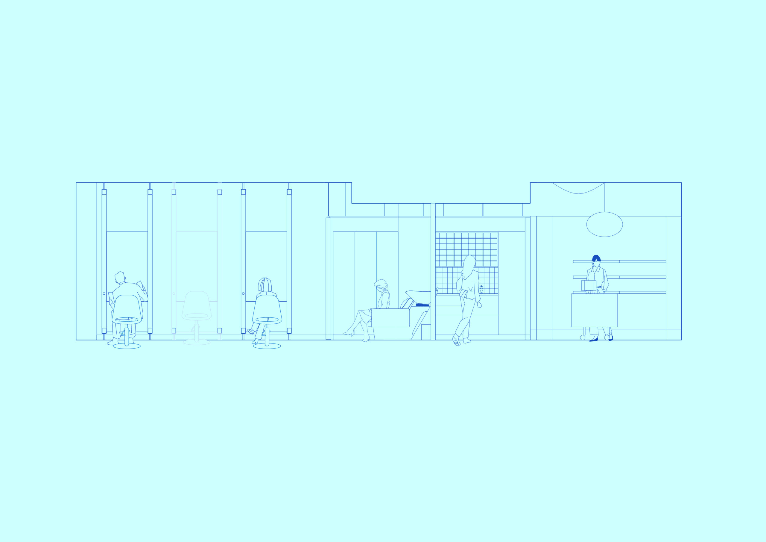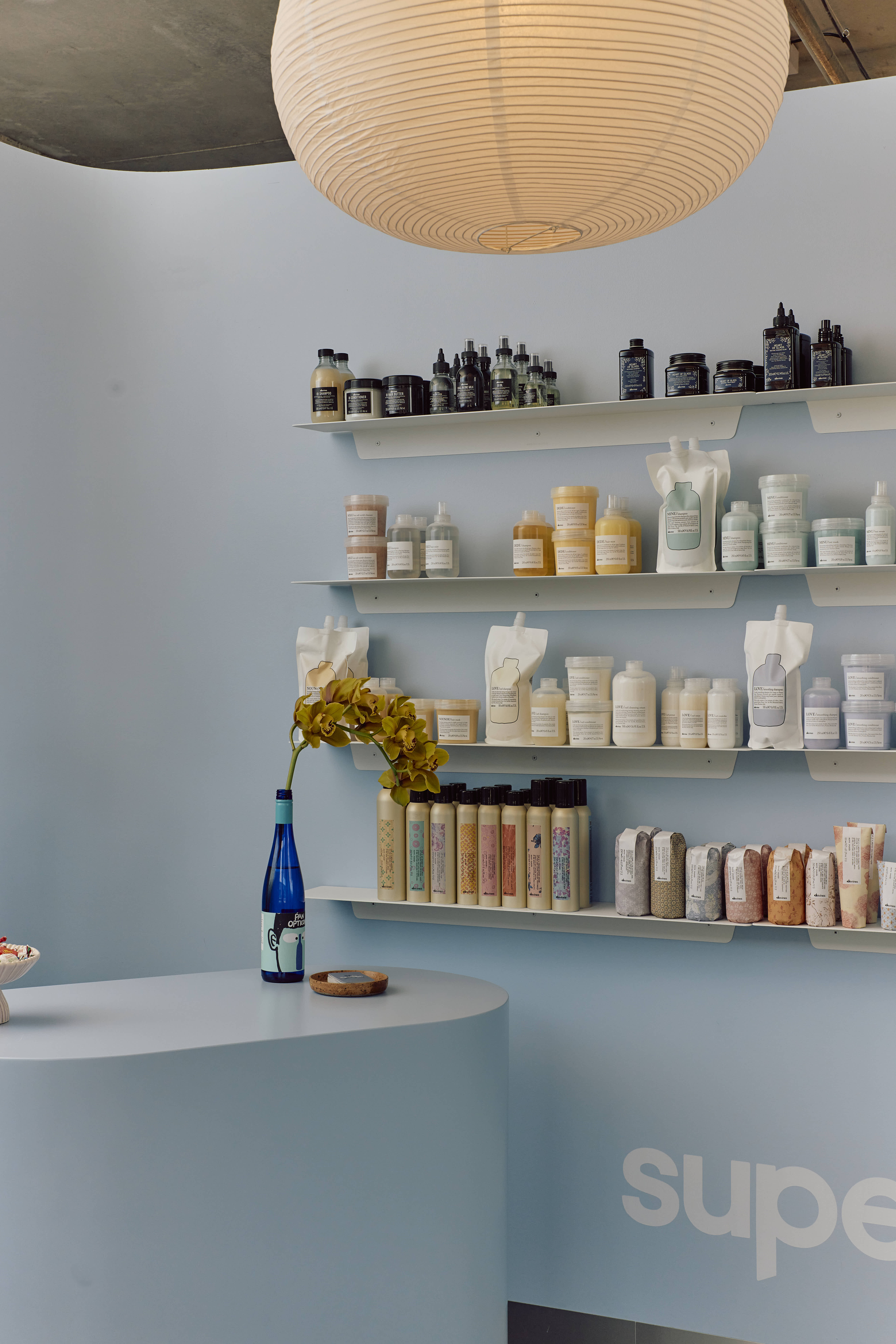 The small space uses a mix of natural materials and vibrant immersive colour to delineate different areas. Visitors are met at the entry by smooth blue curves and shelves displaying a selection of perfectly pastel retail products. The zone is saturated in a light blue colour, that reappears subtly throughout the rest of the salon, including a tiled blue ledge along the windows and cabinets stained a deep blue by Jess herself.