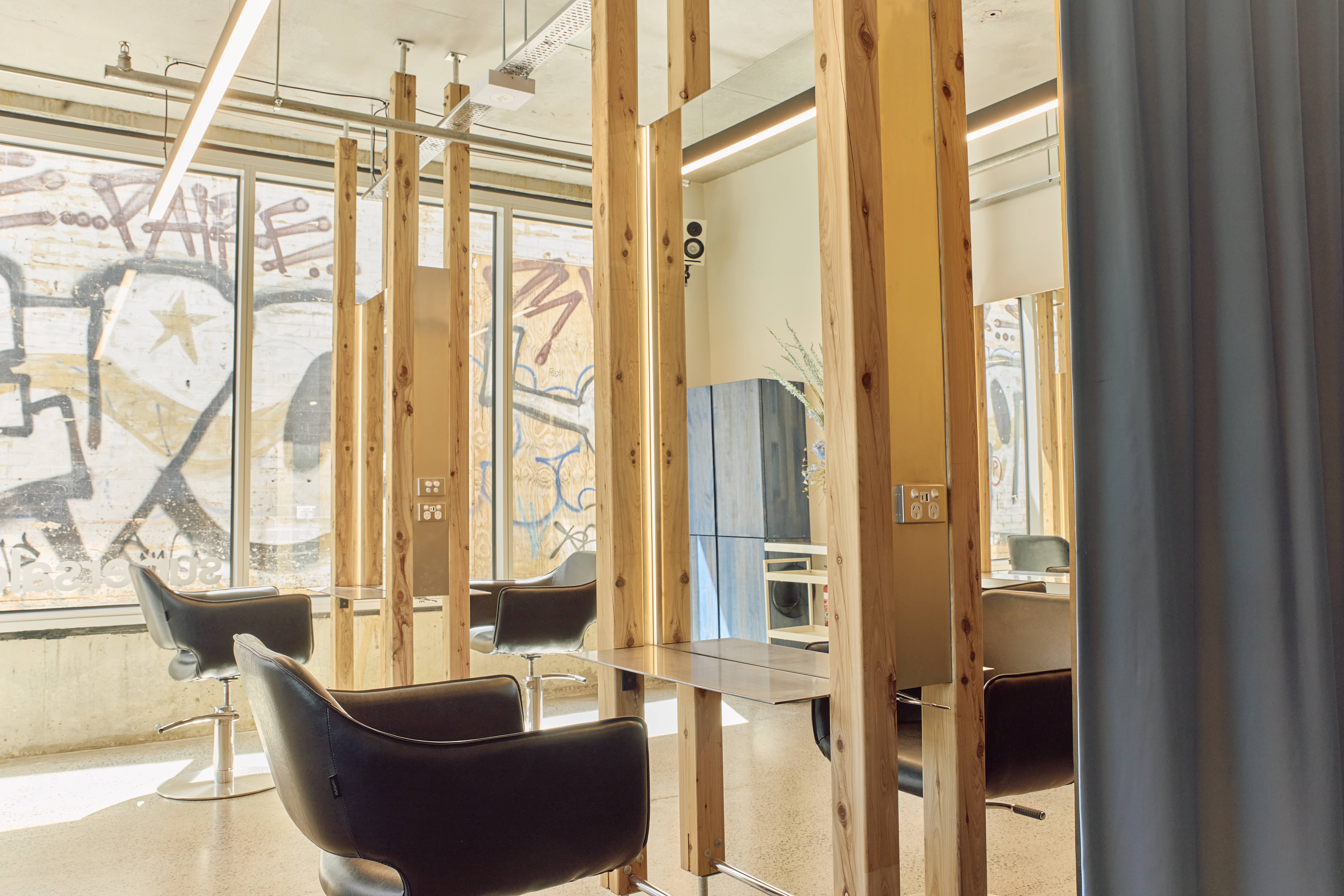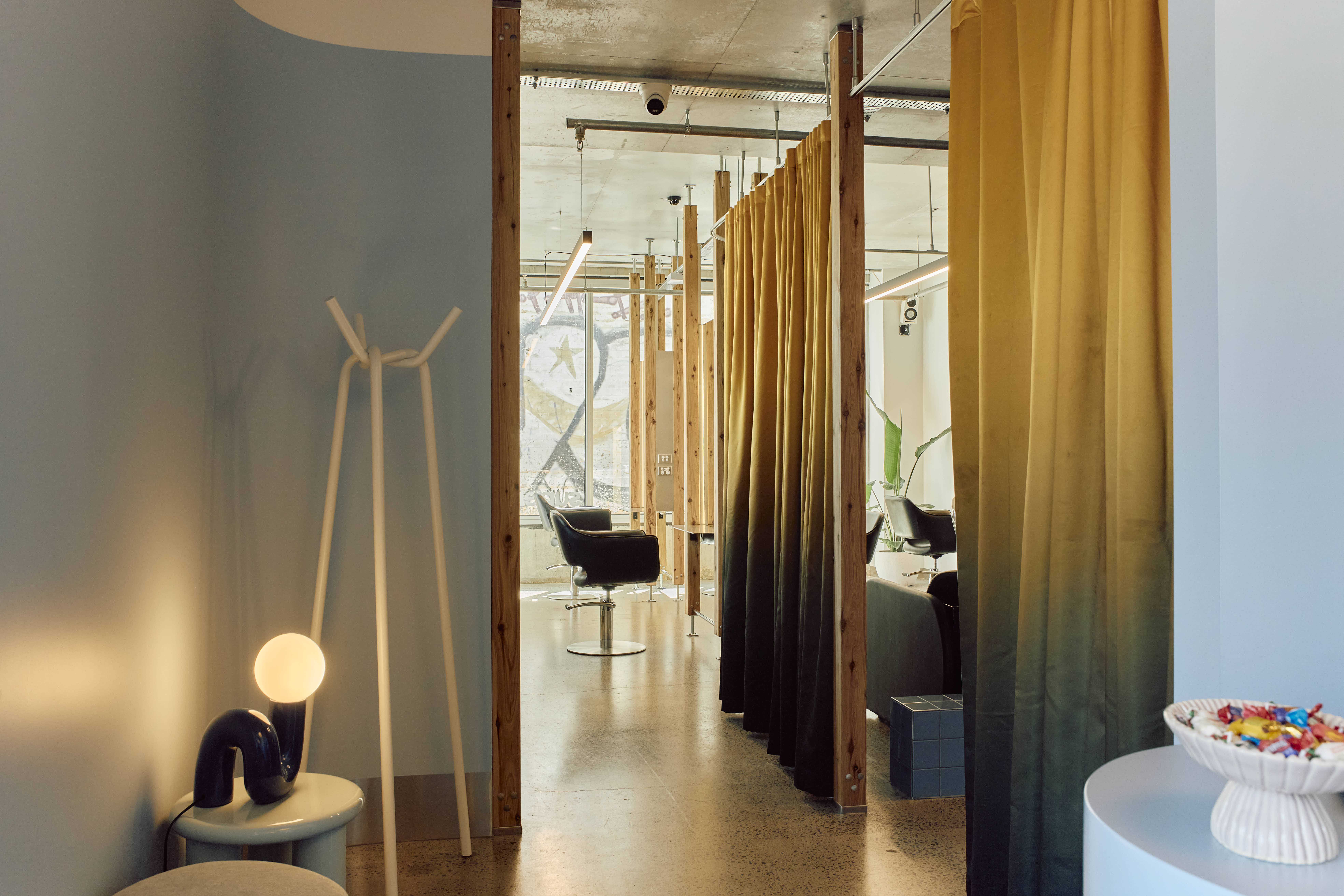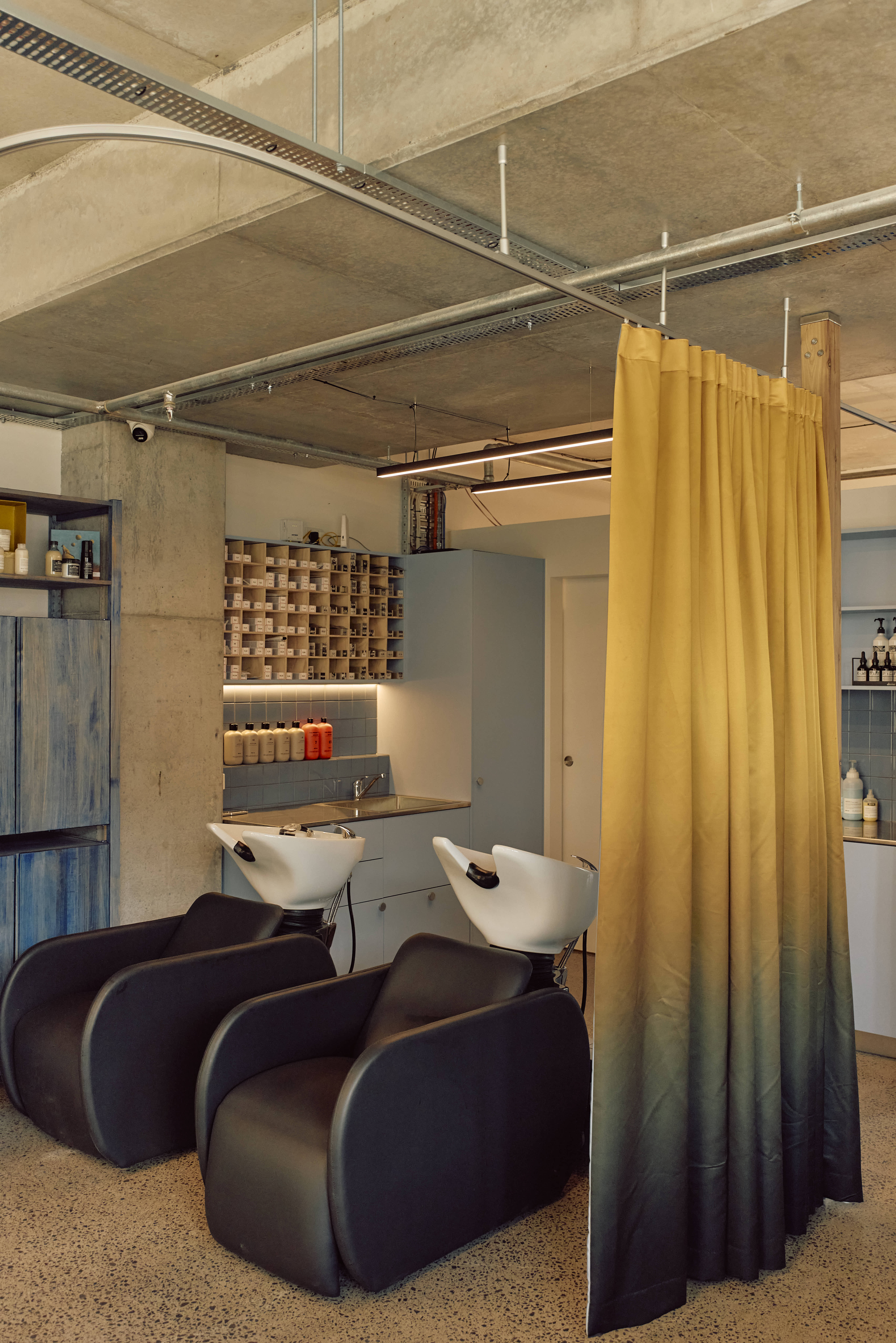 The shampoo area provides a unique, serene experience. It is enveloped by a curtain of fabric repurposed from the former Suku Dream Baby space on Gertrude Street. The fabric is gradient orange on the outside and an all-encompassing blue on the inside, creating an ocean of calm for clients. This swathe of colour transitions into the main salon area, which is distinguished by individual stations, each framed by floating timber posts that are elevated off the ground by slim supports. This approach allows the cutting stations to feel lightweight and ensure this small space still feels open and inviting.