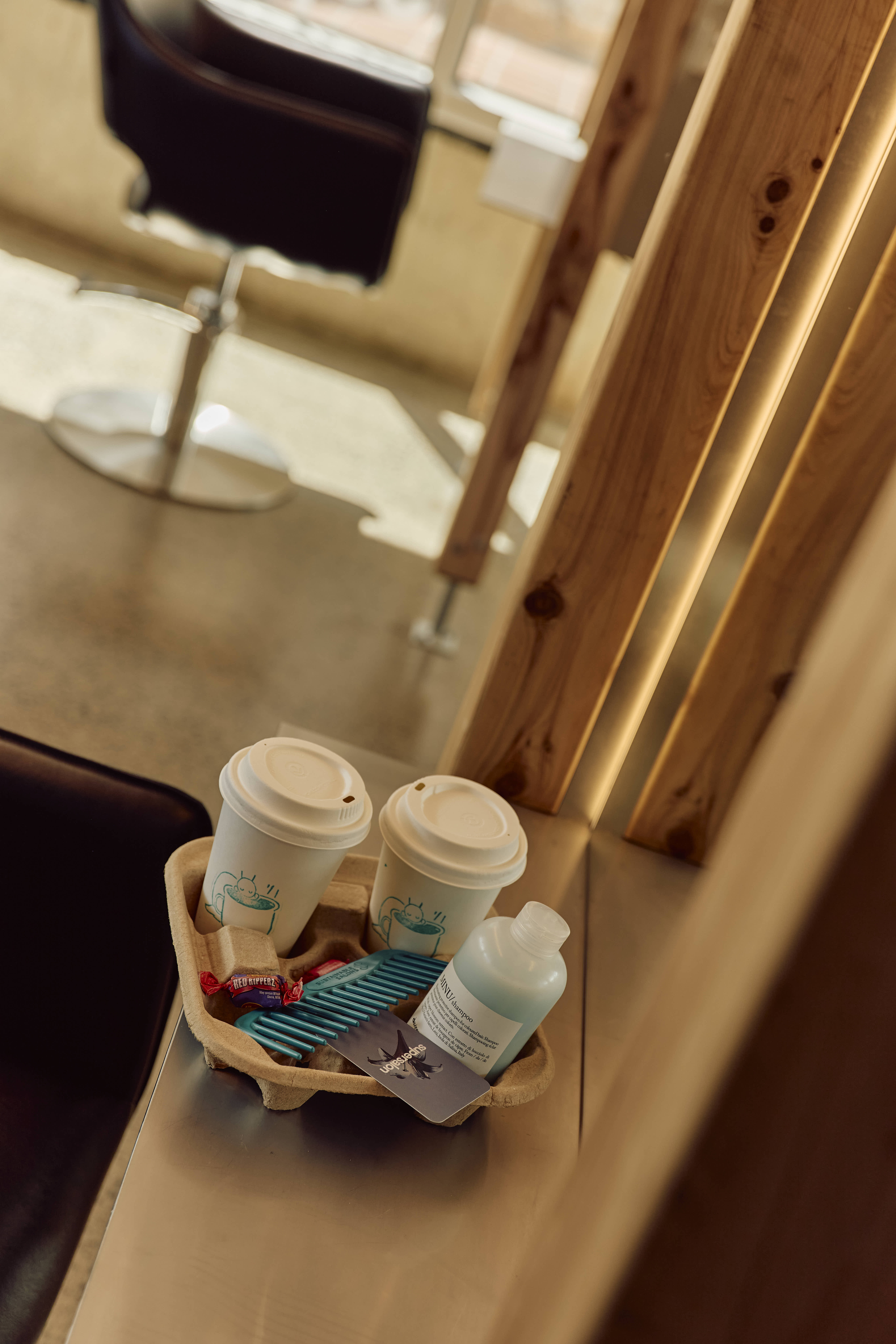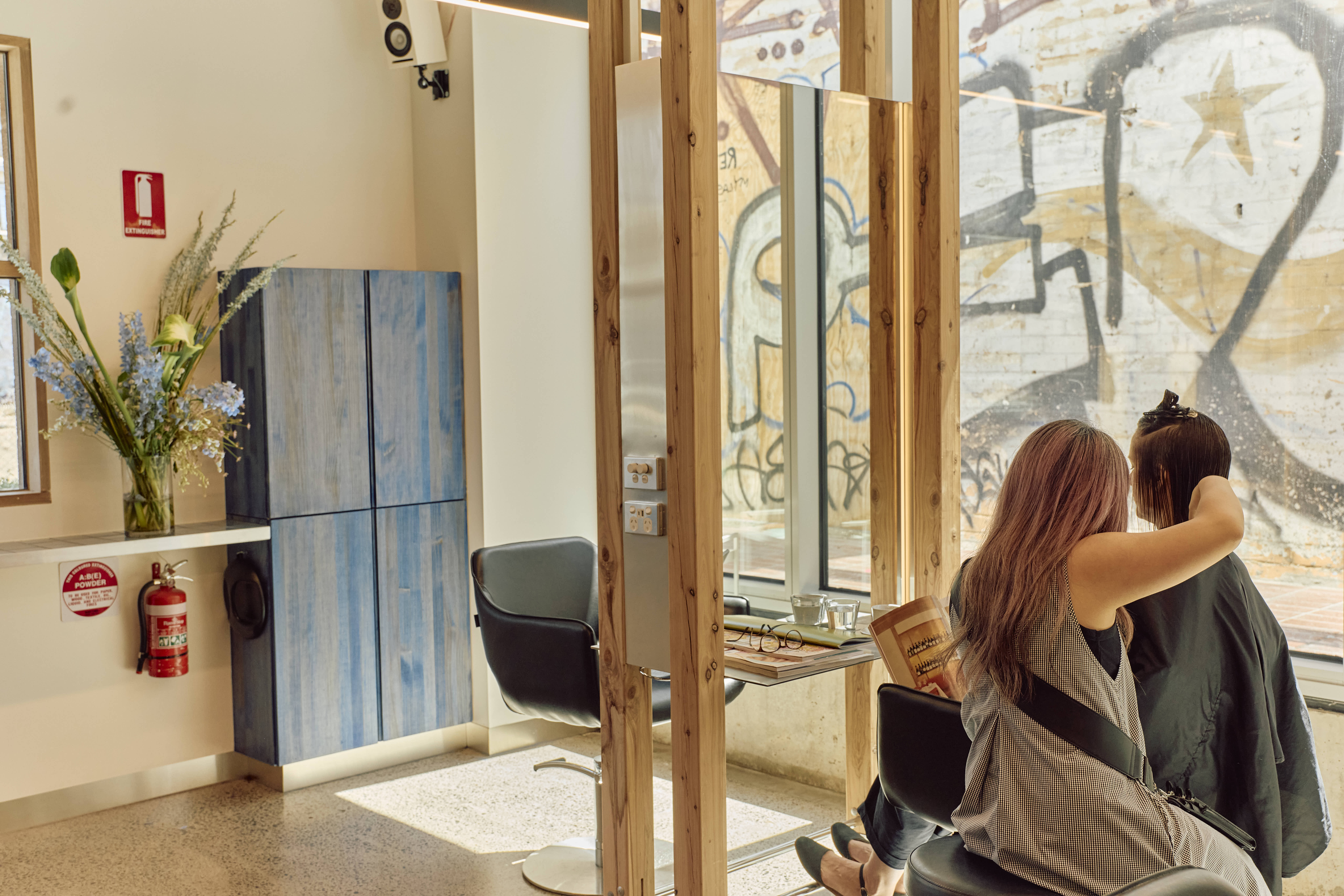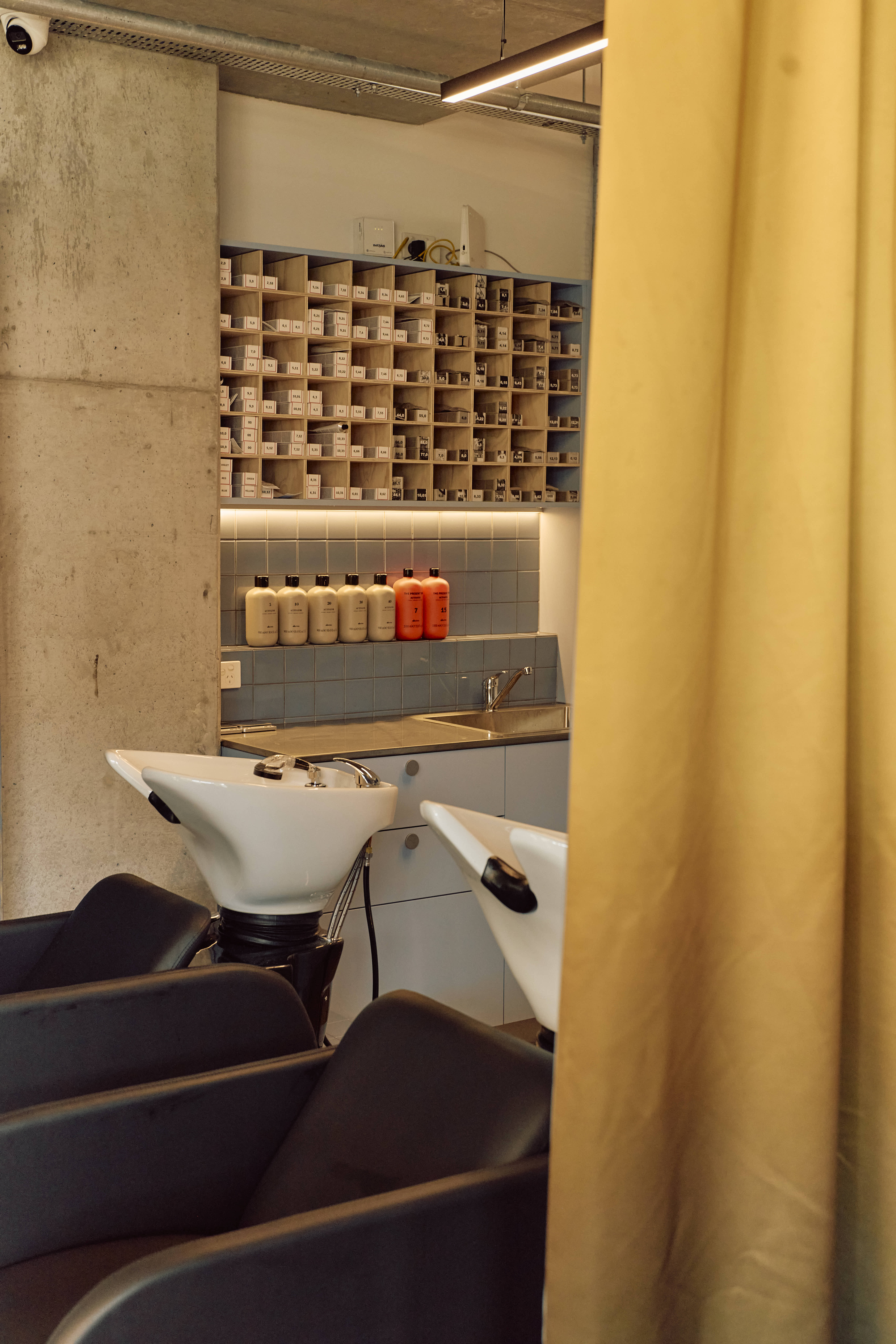 The shampoo area provides a unique, serene experience. It is enveloped by a curtain of fabric repurposed from the former Suku Dream Baby space on Gertrude Street. The fabric is gradient orange on the outside and an all-encompassing blue on the inside, creating an ocean of calm for clients. This swathe of colour transitions into the main salon area, which is distinguished by individual stations, each framed by floating timber posts that are elevated off the ground by slim supports. This approach allows the cutting stations to feel lightweight and ensure this small space still feels open and inviting.