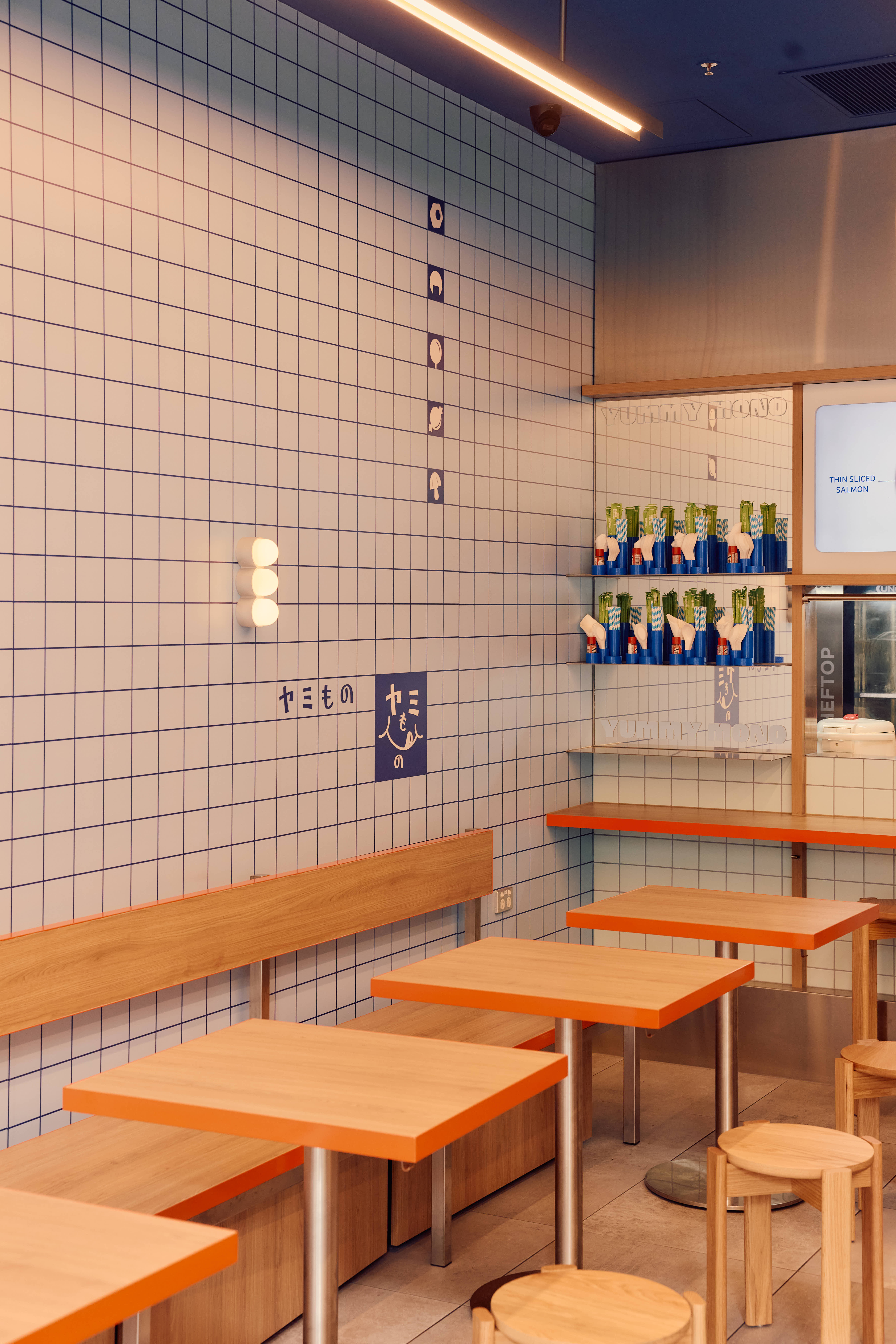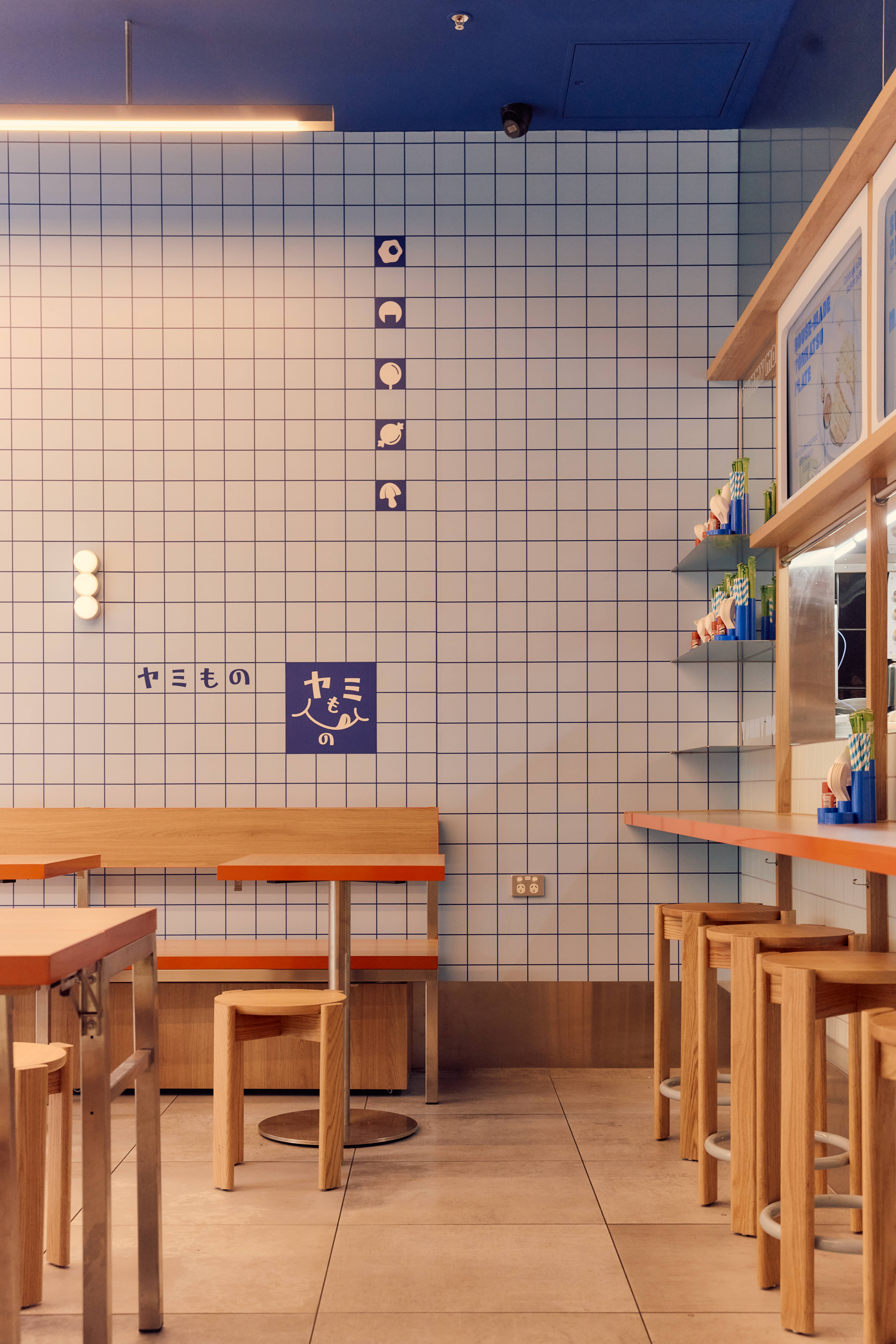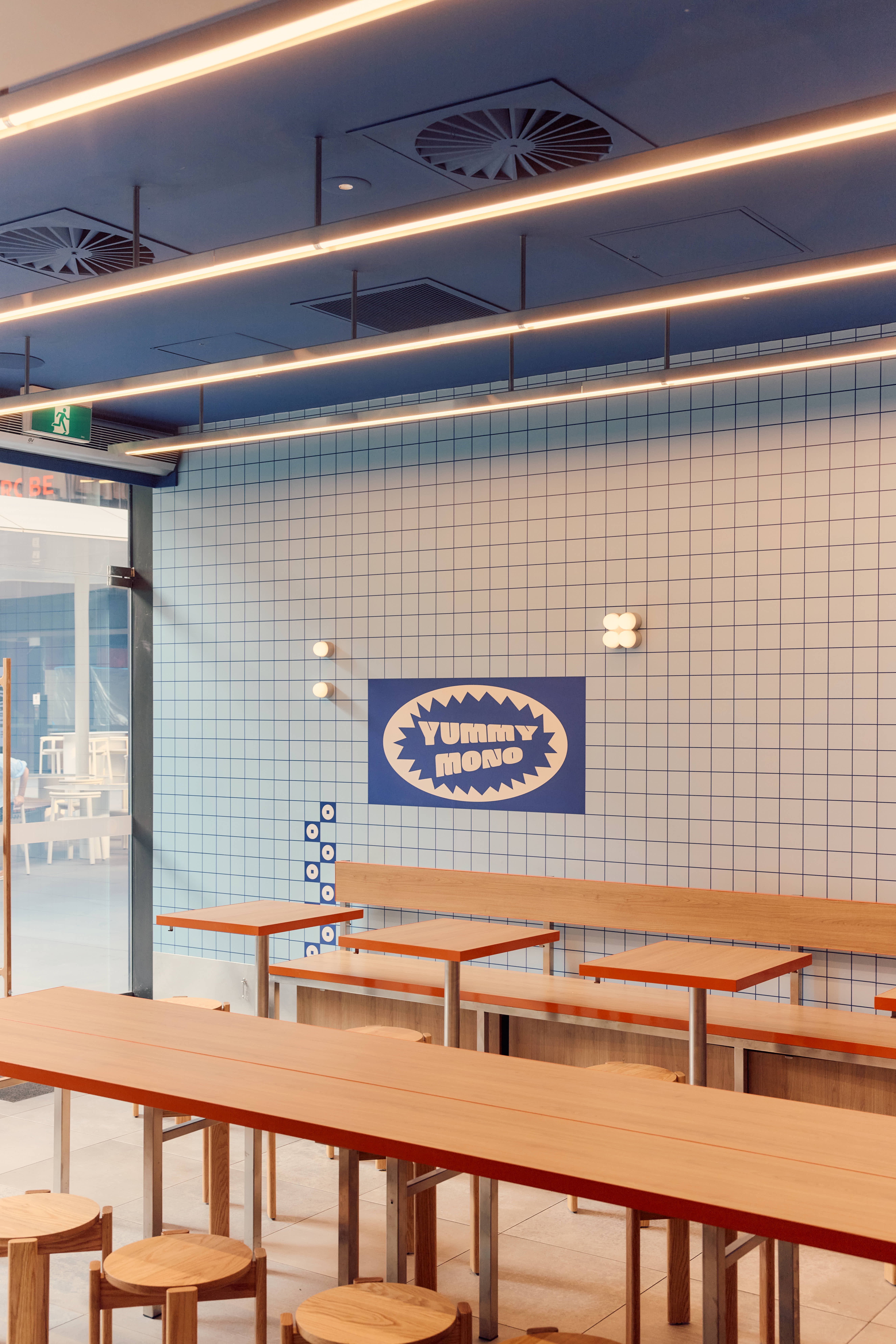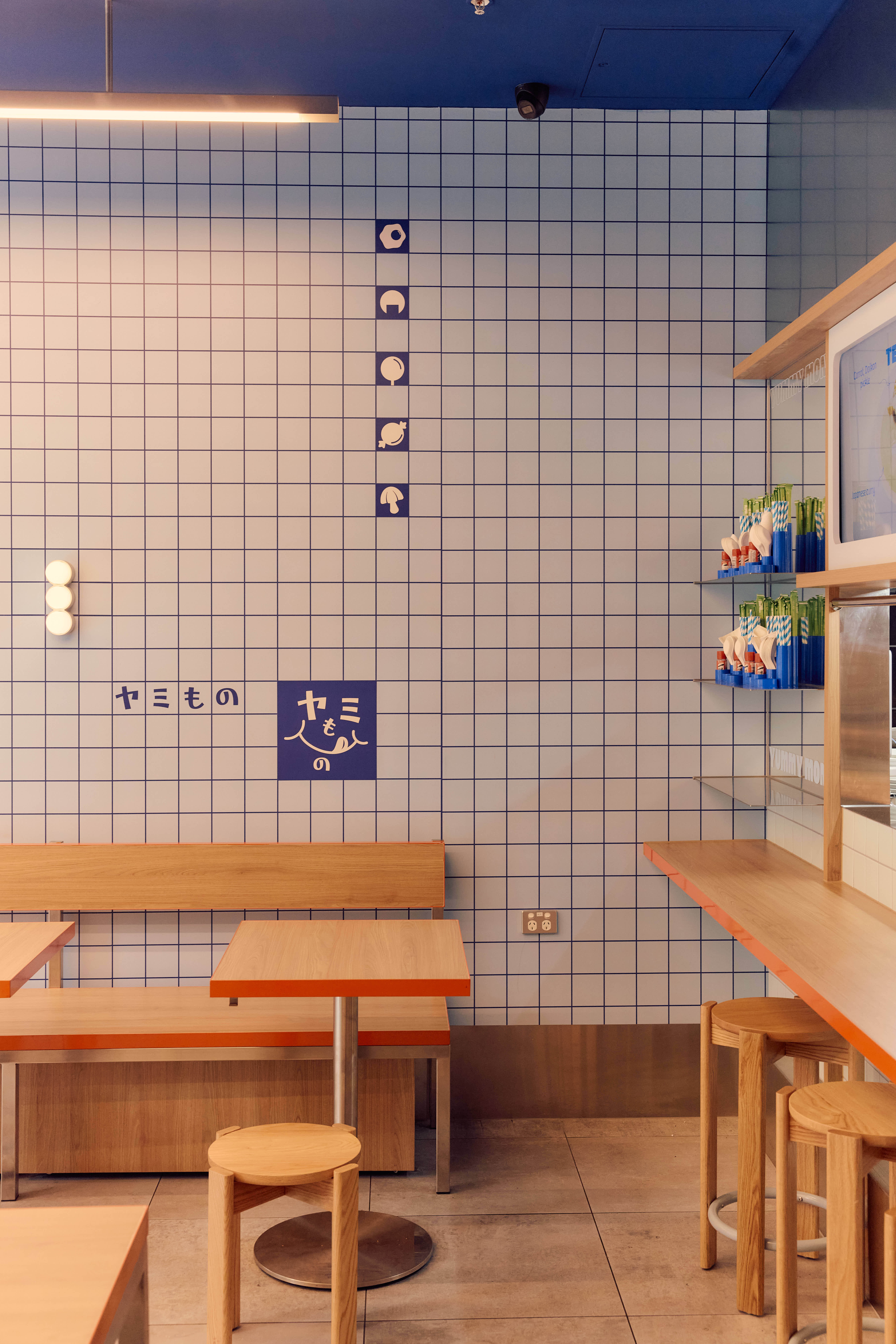 We designed the space simultaneously with the branding for Yummy Mono. The selection of colour was key to creating a space that felt like a continuation of the brand. Shades of blue are the hero; we wanted a colour that felt immersive while visually complementing the food on offer. Splashes of orange were introduced to create contrast and complement the timber tones in the space.