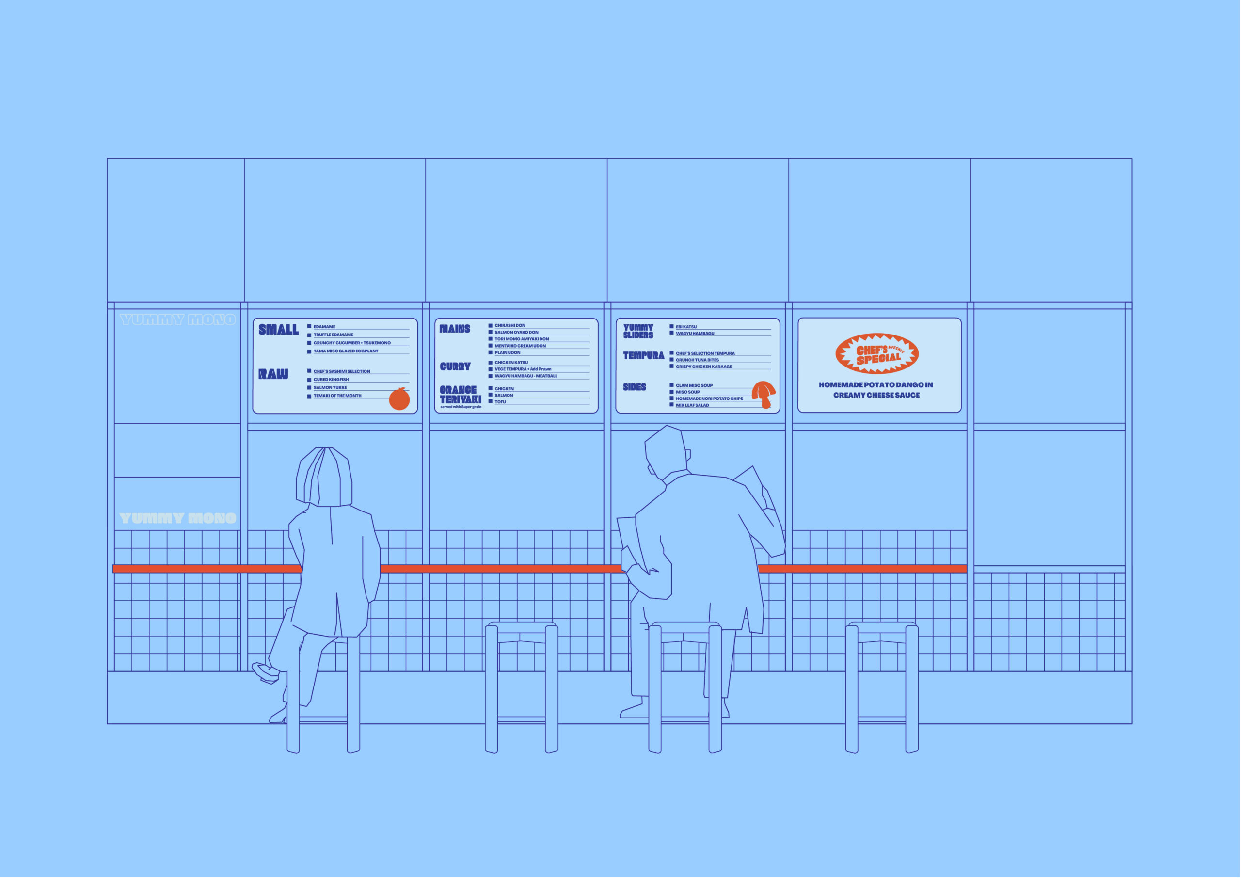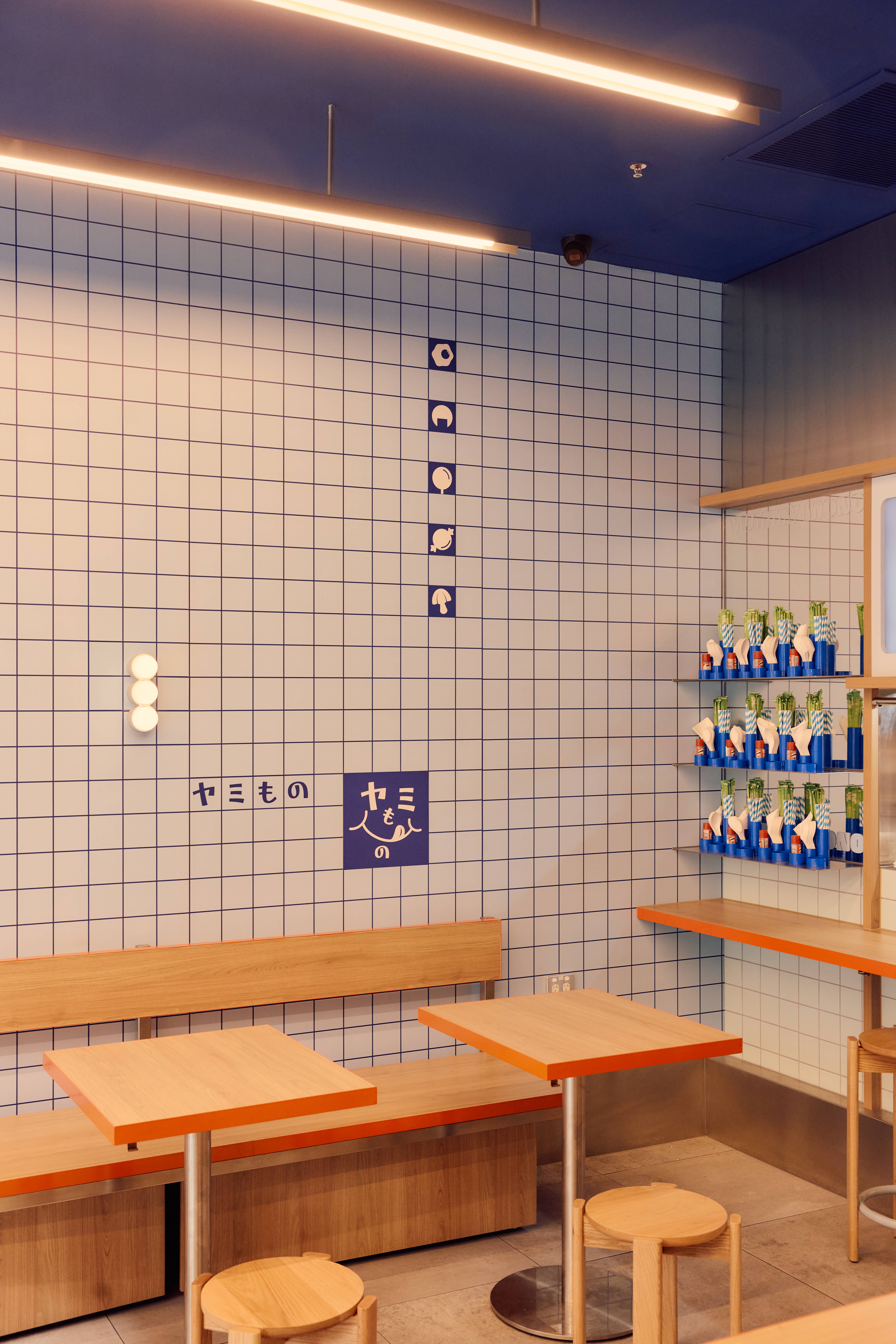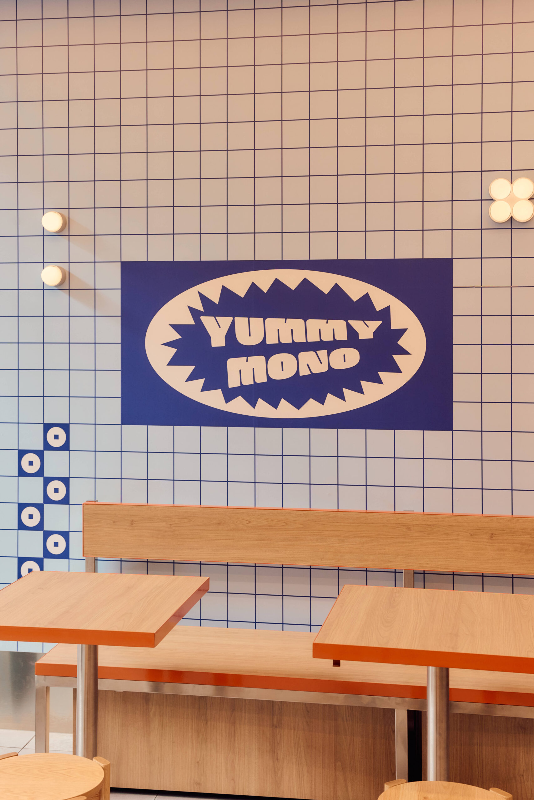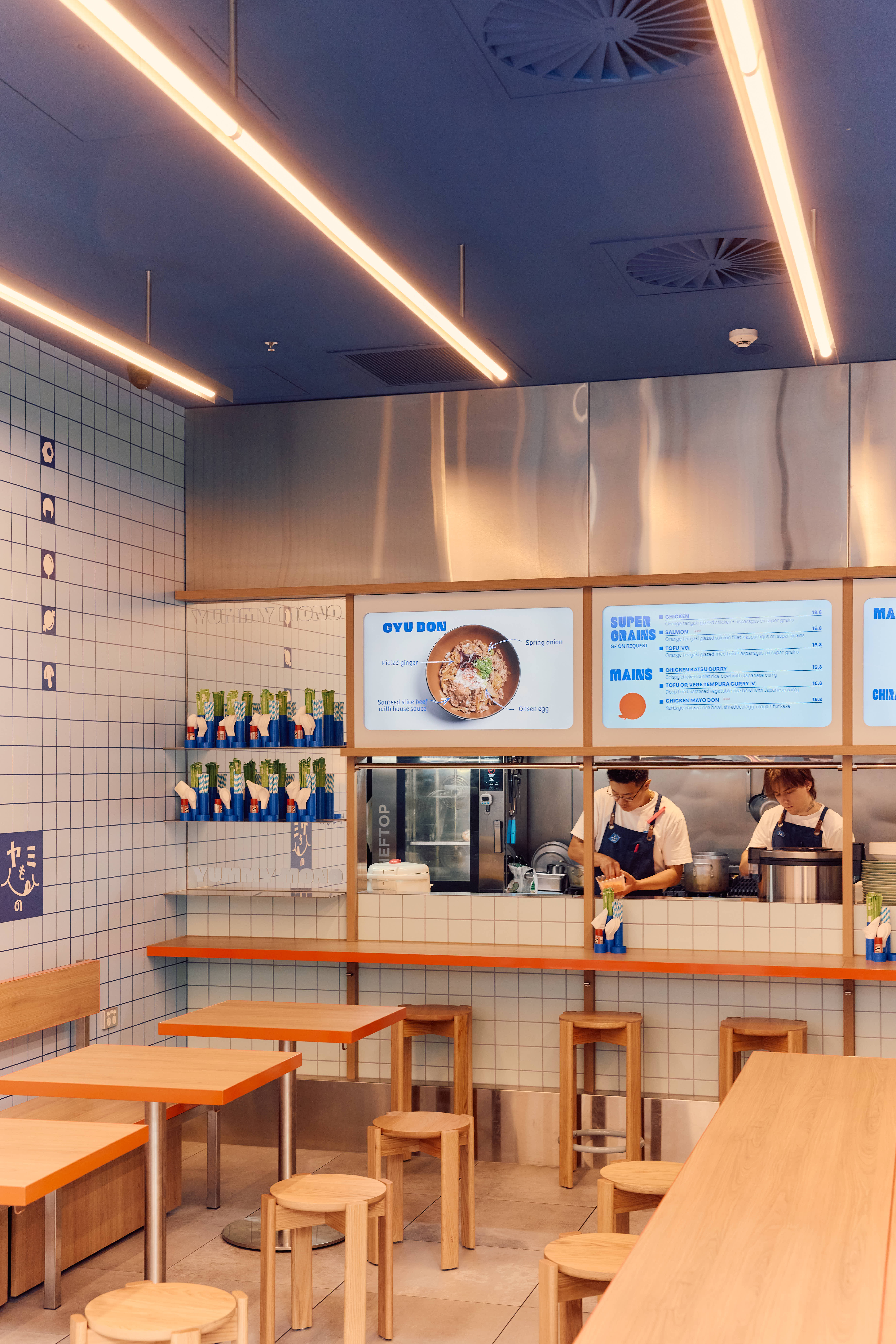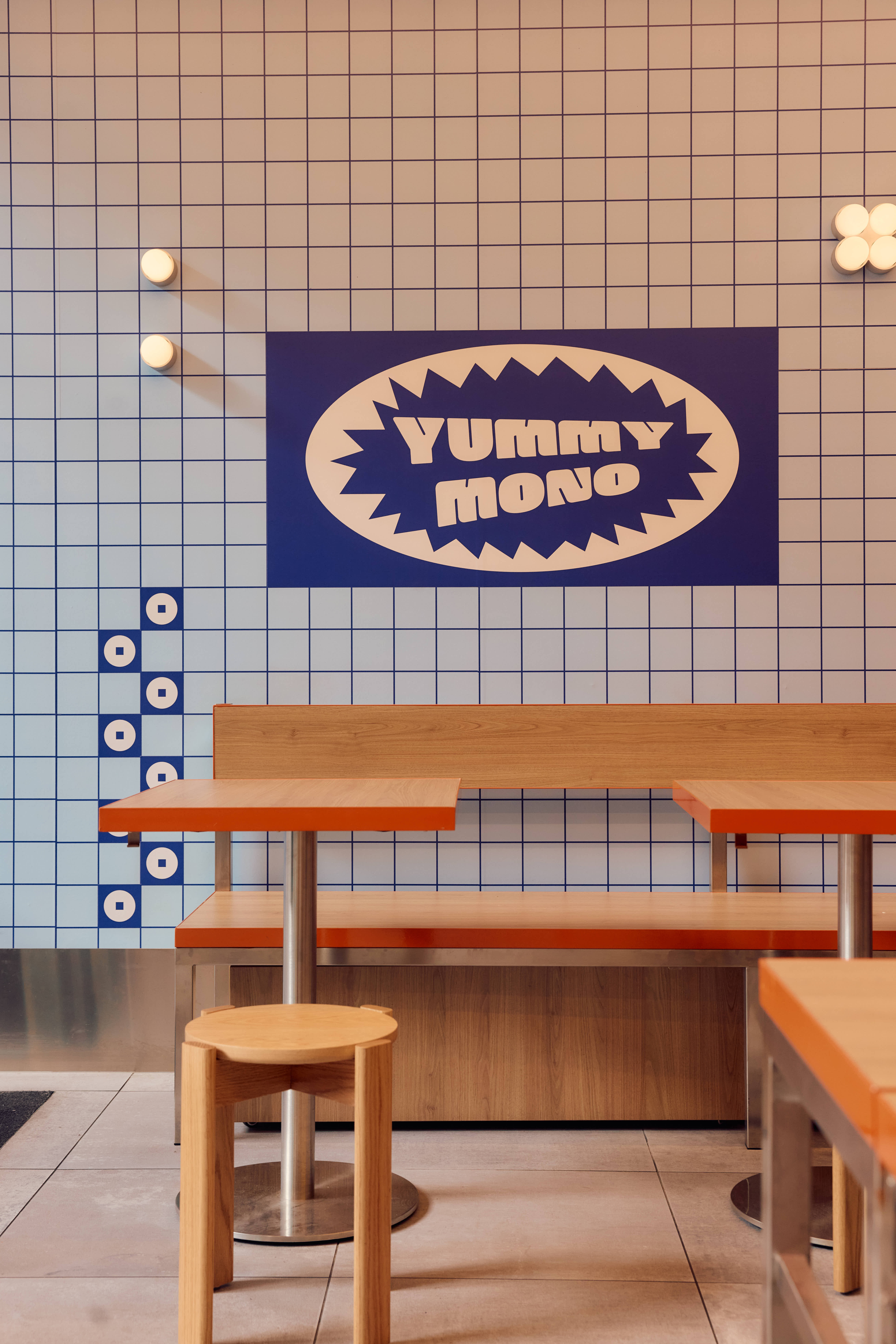 We designed the space simultaneously with the branding for Yummy Mono. The selection of colour was key to creating a space that felt like a continuation of the brand. Shades of blue are the hero; we wanted a colour that felt immersive while visually complementing the food on offer. Splashes of orange were introduced to create contrast and complement the timber tones in the space.