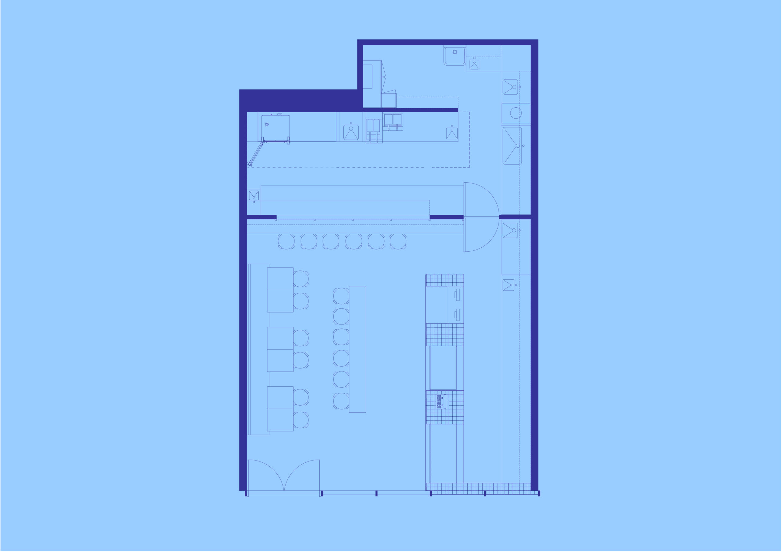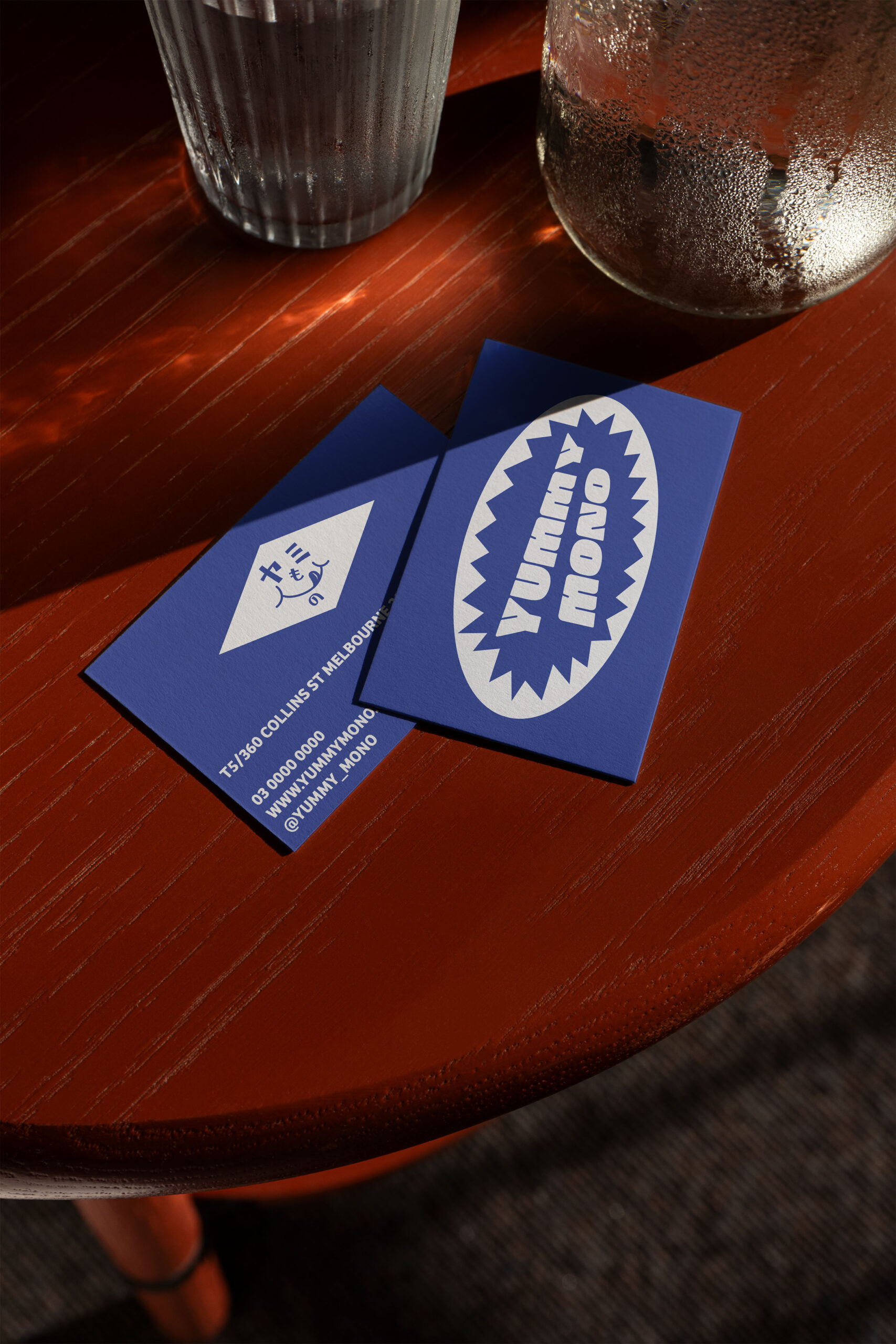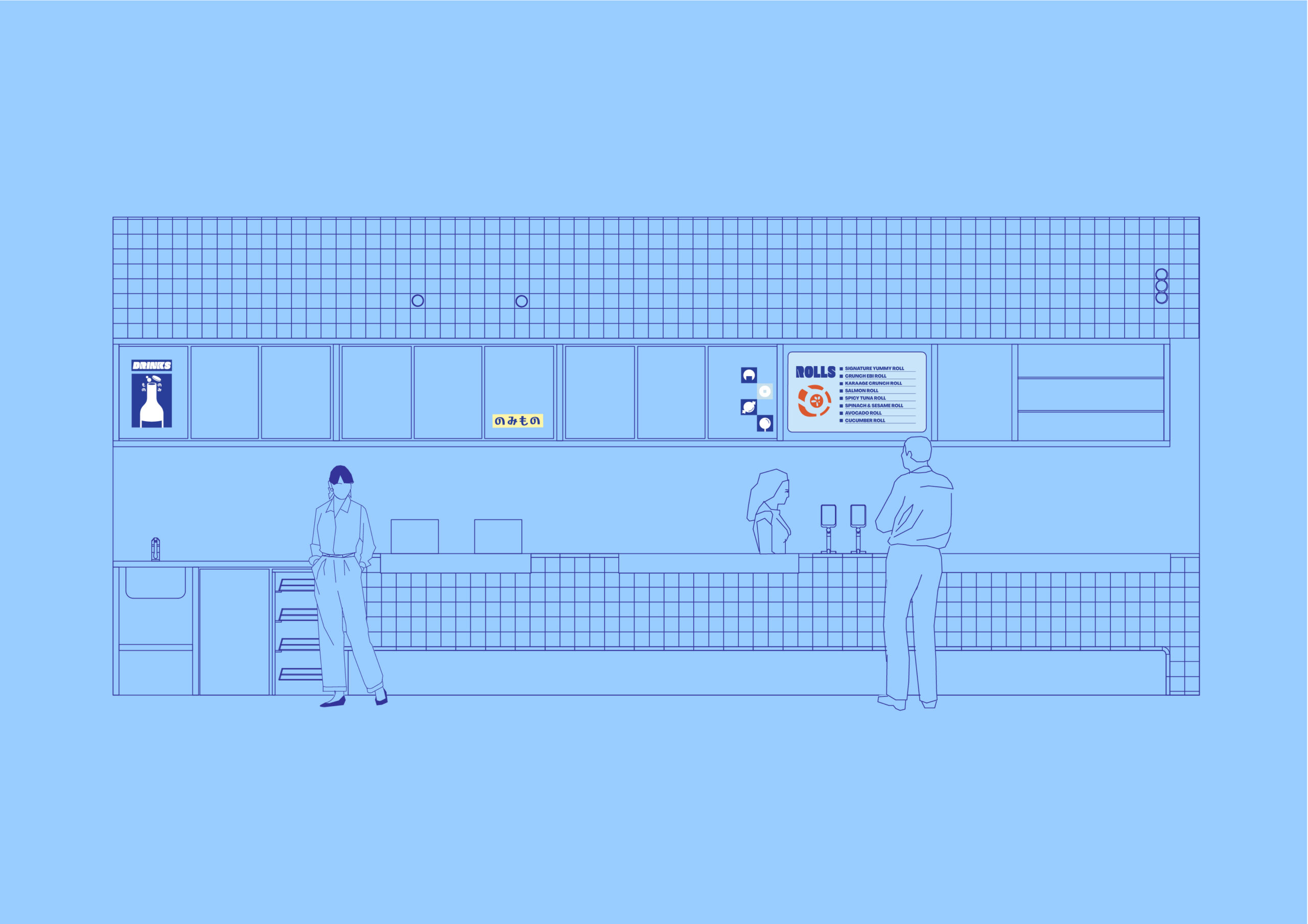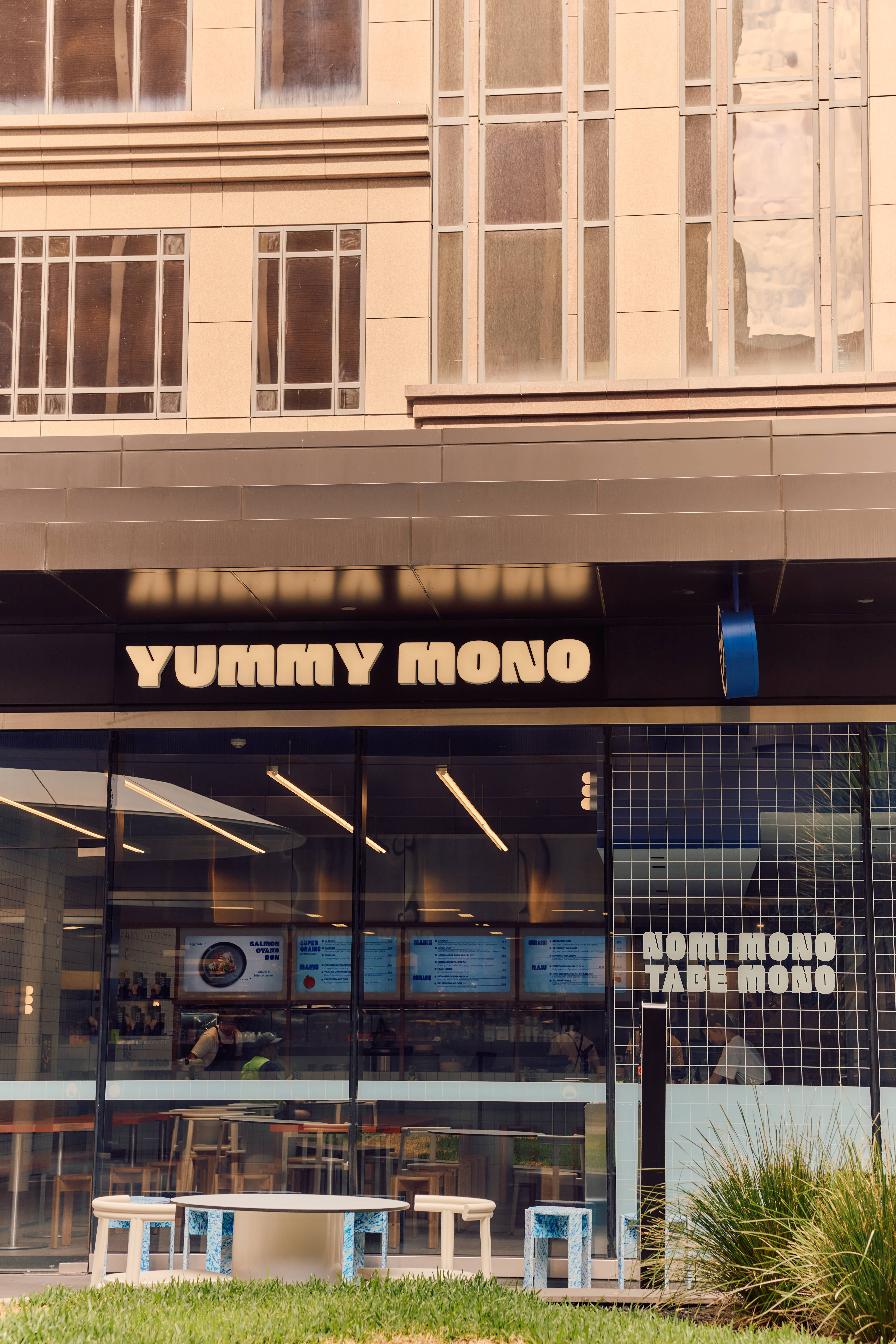 We designed the space simultaneously with the branding for Yummy Mono. The selection of colour was key to creating a space that felt like a continuation of the brand. Shades of blue are the hero; we wanted a colour that felt immersive while visually complementing the food on offer. Splashes of orange were introduced to create contrast and complement the timber tones in the space.