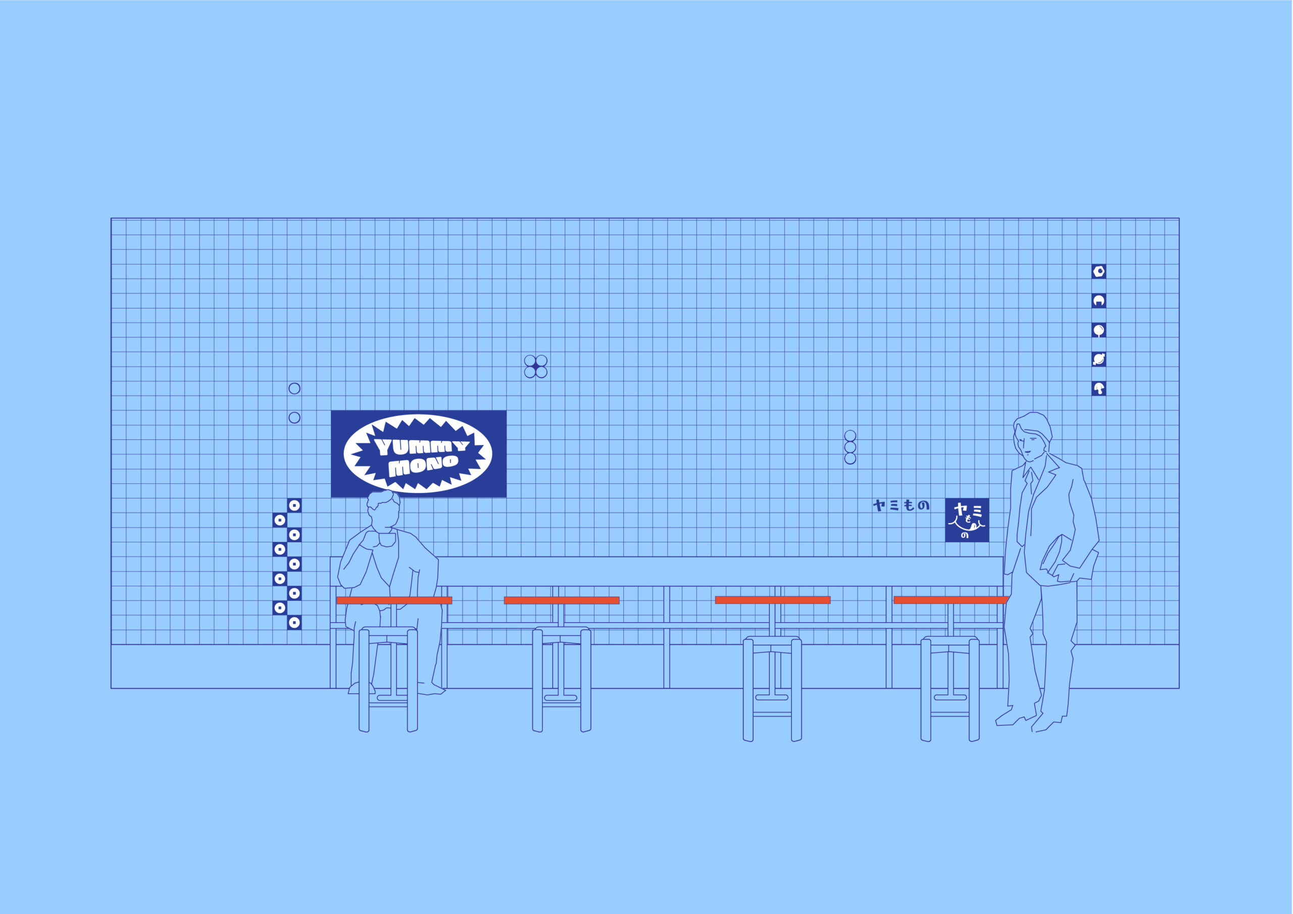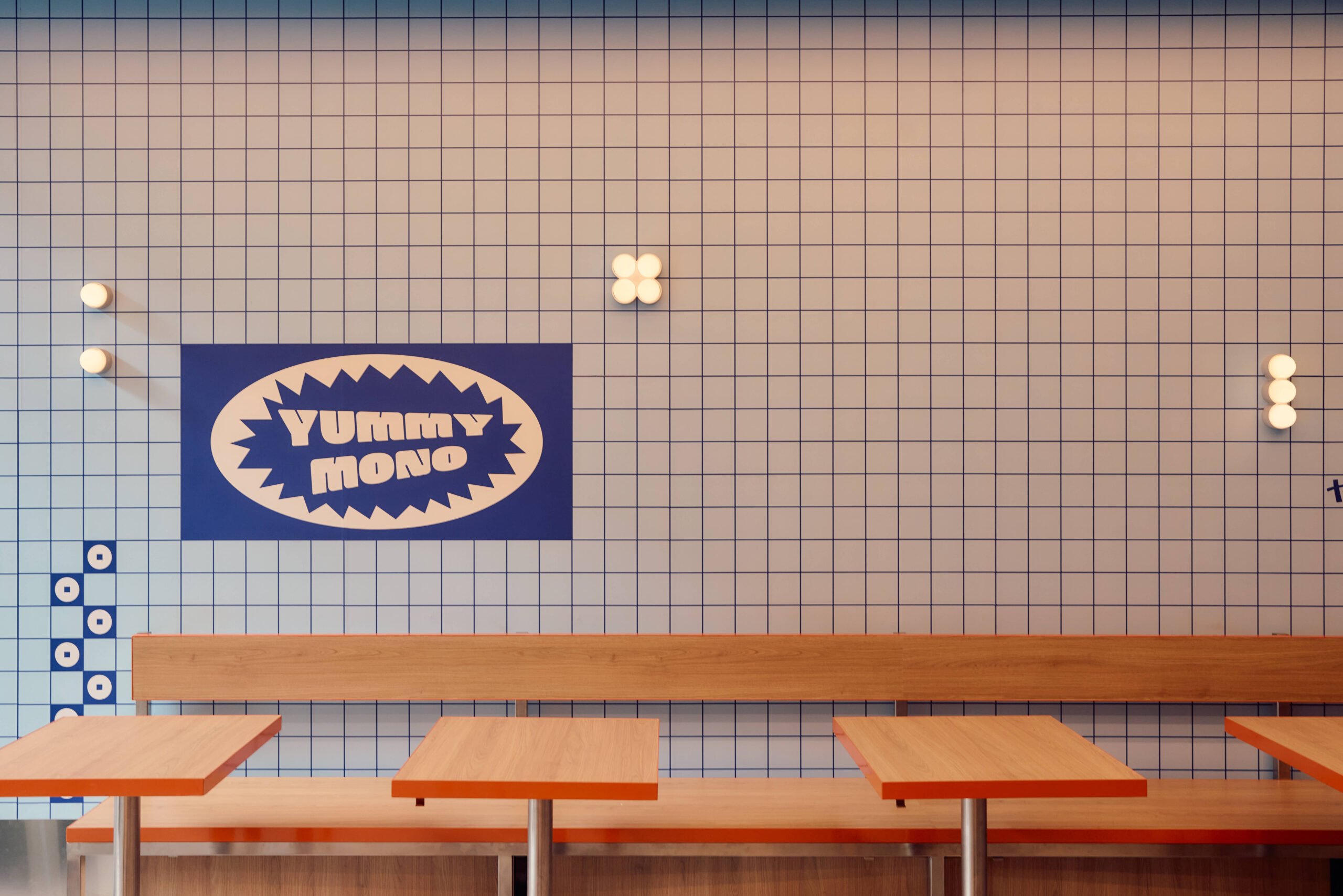 The space personifies the playfulness of the brand, with graphic elements such as stickers adorning the walls and cabinetry. The line is blurred between graphic application and materials; surfaces alternate between a 100 x 100 tile and a 100 x 100 cut vinyl grid. Interspersed among the graphic elements are various configurations of the Objects for Thought Rider wall light, which creates a physical touch point to contrast against the other 2D elements. The brand has a fun and casual persona, captured by the cheeky face with its tongue stuck out. This face is a rearrangement of the Japanese characters for Yummy Mono.